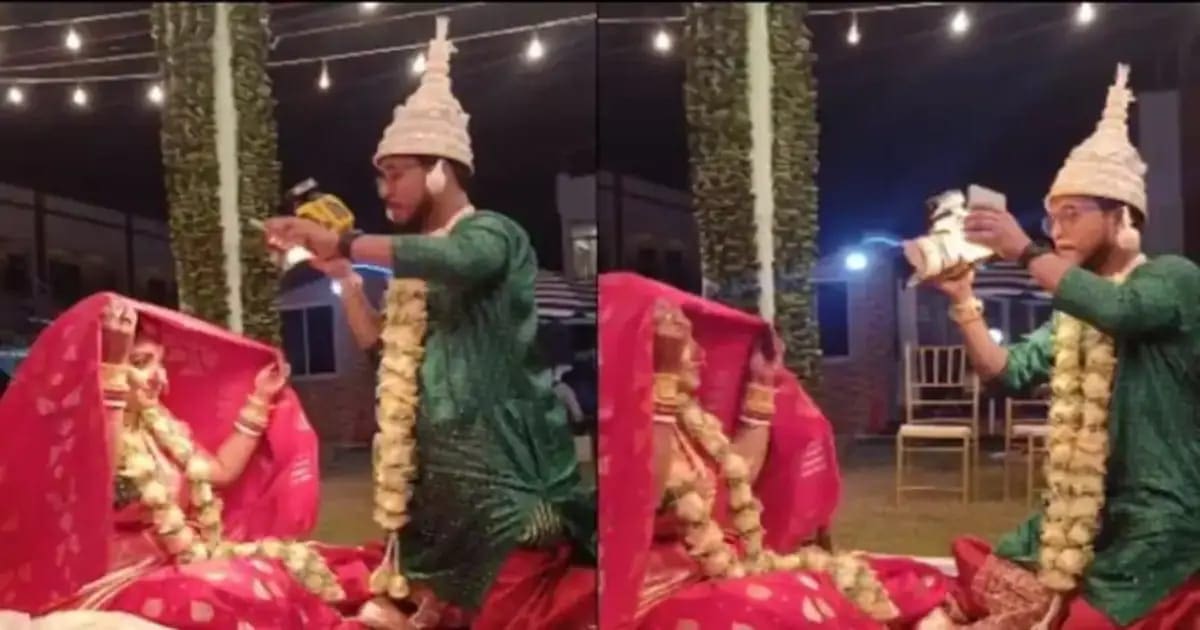 ಮದುವೆ ಸಮಾರಂಭದಲ್ಲಿ ಮುಳುಗಿದ್ದ ನವ ಜೋಡಿಯ ಮುಖದಲ್ಲಿ ಖುಷಿ, ಸಂತೋಷ ದುಪ್ಪಟ್ಟಾಗೋದು ಸಹಜ. ಆದರೆ, ಮದುವೆ ಸಮಾರಂಭದಲ್ಲಿ ಫೋಟೋಗ್ರಾಫರ್ ಒಬ್ಬ ವಧುವಿನ ಫೋಟೋ ಶೂಟ್ ಚೆನ್ನಾಗಿ ಮಾಡುತ್ತಿಲ್ಲ ಎಂದು ವಧು(Bride) ಕೋಪ ಮಾಡ್ಕೊಂಡು ಕೂತಿದ್ದನ್ನು ನೋಡಿ ವರ(Groom) ತಾನೇ ಕ್ಯಾಮೆರಾ ಹಿಡಿದು ವಧುವಿನ ಫೋಟೊ ಕ್ಲಿಕ್ಕಿಸಲು ತೊಡಗುತ್ತಾನೆ. ಸದ್ಯ, ಈ ವೀಡಿಯೋ(Video) ಇನ್ಸ್ತಾ ಗ್ರಾಂ (Instagram) ನಲ್ಲಿ ವೈರಲ್ ಆಗಿ ಸಂಚಲನ ಮೂಡಿಸಿದೆ.