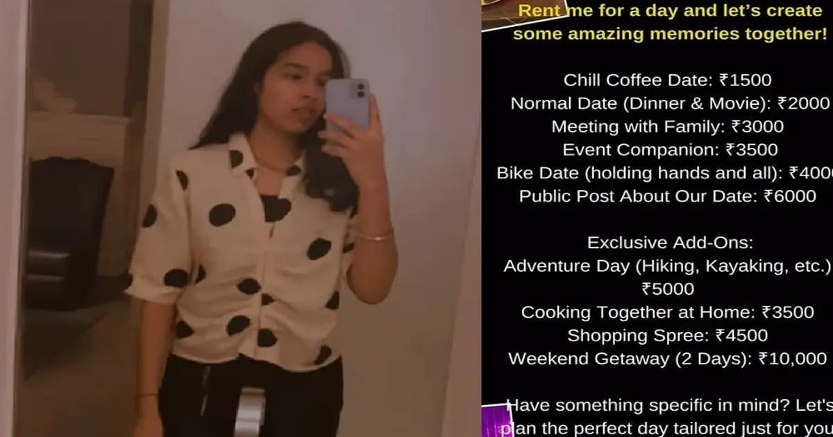ಜಪಾನ್, ಚೀನಾ ದೇಶಗಳಲ್ಲಿ ಬಾಡಿಗೆ ಸಂಬಂಧಗಳು ಜನಪ್ರಿಯವಾಗಿವೆ. ಹಣ ನೀಡಿದರೆ ಸಾಕು ಬಾಡಿಗೆಗೆ ಜನರು ಸಿಗುತ್ತಾರೆ. ಡಿನ್ನರ್ ಮಾಡಲು, ಓಡಾಡಲು, ಸಿನಿಮಾ ನೋಡಲು ಸಿಗುತ್ತಾರೆ. ಆದರೀಗ ಅದರದ್ದೇ ಭಾಗವಾಗಿರೋ ಡೇಟಿಂಗ್ ಸಂಸ್ಕೃತಿ ಭಾರತಕ್ಕೆ ಲಗ್ಗೆ ಇಟ್ಟಿದೆ. ಭಾರತೀಯ ಯುವತಿಯೊಬ್ಬಳು ತಾನು ಬಾಡಿಗೆ ಸಿಗುತ್ತೇನೆ(Rent Girl) ಎಂದು ಸಾಮಾಜಿಕ ಜಾಲತಾಣದಲ್ಲಿ ಪೋಸ್ಟ್ ಹಂಚಿಕೊಂಡಿದ್ದಾಳೆ. ಜೊತೆಗೆ ಬಾಡಿಗೆ ಪಡೆಯುವುದಕ್ಕೂ ಮುನ್ನ ಆಕೆಗೆ ಹಣವನ್ನು ನೀಡಬೇಕಾಗಿದೆ. ಅದಕ್ಕೆಂದೇ ಲಿಸ್ಟ್ ತಯಾರಿಸಿಕೊಂಡಿದ್ದಾಳೆ.