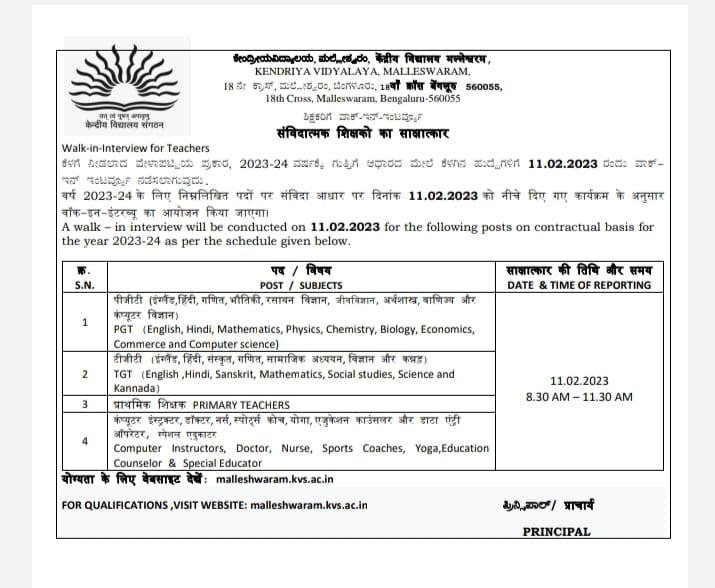 ಟೀಚರ್ ಹುದ್ದೆ ಬಯಸುವವರಿಗೆ ಇದೊಂದು ಭರ್ಜರಿ ಆಫರ್. ಈ ಹುದ್ದೆ ಬೆಂಗಳೂರಿನಲ್ಲಿದ್ದು ಇಲ್ಲಿ ಕೆಲಸ ಮಾಡೋಕೆ ಆಸಕ್ತರಿರುವವರು ಅರ್ಜಿ ಸಲ್ಲಿಸಬಹುದು. ಮಲ್ಲೇಶ್ವರಂನ ಕೇಂದ್ರೀಯ ವಿದ್ಯಾಲಯದಲ್ಲಿ ಖಾಲಿ ಇರುವ ಟೀಚರ್ ಹುದ್ದೆಗಳಿಗೆ ನೇಮಕಾತಿ ಪ್ರಕ್ರಿಯೆ ನಡೆಯಲಿದೆ. ಹುದ್ದೆಯ ಕುರಿತು ಹೆಚ್ಚಿನ ಮಾಹಿತಿ ಈ ಕೆಳಗೆ ನೀಡಲಾಗಿದೆ. ಫೆ.11,2023 ರಂದು ಸಂದರ್ಶನ ನಡೆಯಲಿದ್ದು ಆಸಕ್ತ ಅಭ್ಯರ್ಥಿಗಳು ಈ ನೇರ ಸಂದರ್ಶನದಲ್ಲಿ ಪಾಲ್ಗೊಳ್ಳಬಹುದು.