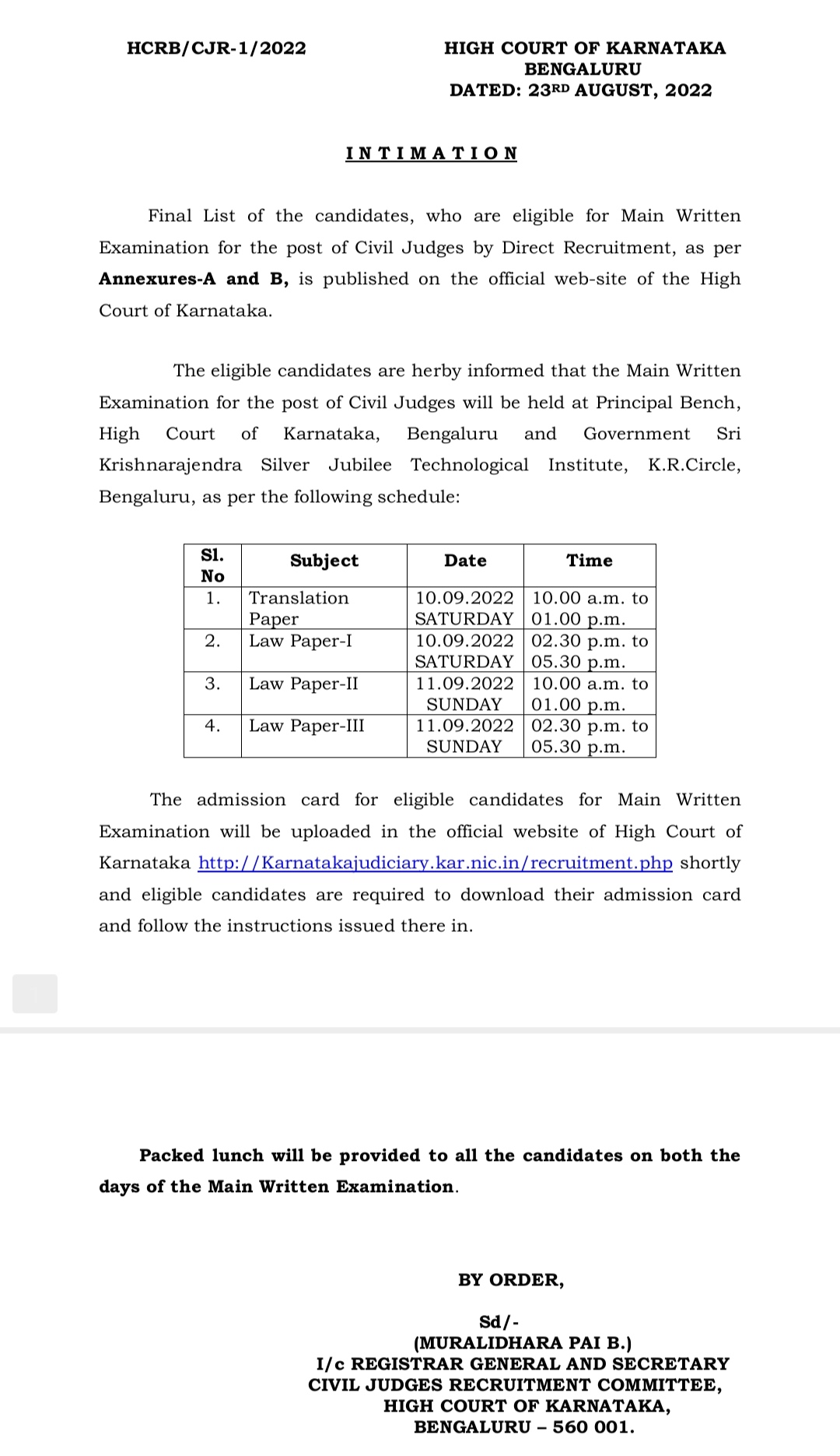 ಈ ಬಗ್ಗೆ ಹೈಕೋರ್ಟ್ ಅಧಿಸೂಚನೆ ಹೊರಡಿಸಿದ್ದು, ಸೆಪ್ಟೆಂಬರ್ 10 ಮತ್ತು 11ರಂದು ಮುಖ್ಯ ಪರೀಕ್ಷೆ ನಡೆಯಲಿದೆ. ಮುಖ್ಯ ಲಿಖಿತ ಪರೀಕ್ಷೆಗಳು ಬೆಂಗಳೂರಿನಲ್ಲಿ ಇರುವ ಕರ್ನಾಟಕ ಹೈಕೋರ್ಟ್ ನ ಪ್ರಧಾನ ಪೀಠ, ಹೈಕೋರ್ಟ್ ಮತ್ತು ಬೆಂಗಳೂರಿನ ಕೆ.ಆರ್. ವೃತ್ತದಲ್ಲಿ ಇರುವ ಶ್ರೀ ಕೃಷ್ಣರಾಜೇಂದ್ರ ಸಿಲ್ವರ್ ಜ್ಯೂಬಿಲಿ ಟೆಕ್ನಲಾಜಿಕಲ್ ಇನ್ಸಿಟ್ಯುಟ್ ನಲ್ಲಿ ನಡೆಯಲಿವೆ.