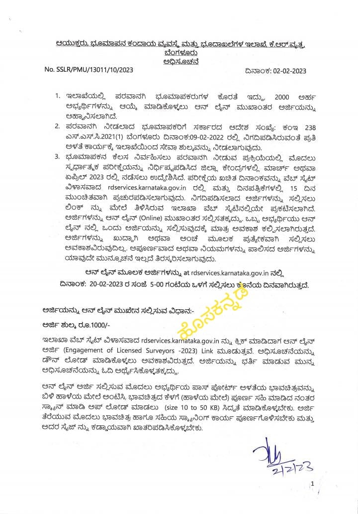 ಬೆಂಗಳೂರು : ಭೂಮಾಪನ ಕಂದಾಯ ಮತ್ತು ಭೂದಾಖಲೆಗಳ ಇಲಾಖೆ ನೇಮಕಾತಿ ಅಧಿಸೂಚನೆ 2023 ಅನ್ನು ಬಿಡುಗಡೆ ಮಾಡಿದೆ. ಇಲಾಖೆಯಲ್ಲಿ 2,000 ಭೂ ಮಾಪಕ/ಪರವಾನಗಿ ಭೂಮಾಪಕ ಹುದ್ದೆಗಳನ್ನು ಭರ್ತಿ ಮಾಡಲು ಅರ್ಜಿ ಆಹ್ವಾನಿಸಲಾಗಿದೆ.