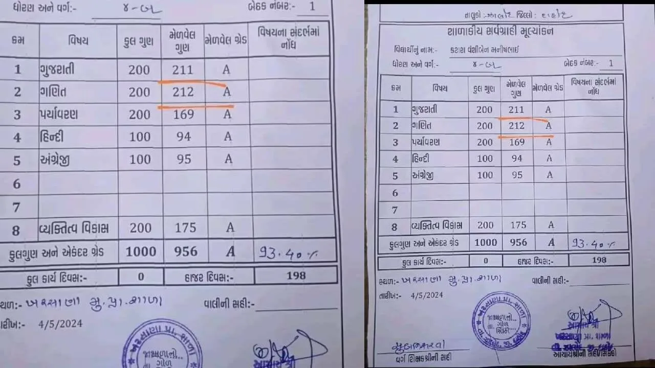 ಗುಜರಾತ್‌ನ(Gujarath) ದಾಹೋದ್ ಜಿಲ್ಲೆಯ(Dahod District) ಪ್ರಾಥಮಿಕ ಶಾಲೆಯೊಂದರಲ್ಲಿ ಓದುತ್ತಿರುವ ವಂಶಿಬೆನ್ ಮನೀಶ್‌ಭಾಯ್(Vamshiben Manish Bhay) ಎಂಬ ನಾಲ್ಕನೇ ತರಗತಿ ವಿದ್ಯಾರ್ಥಿನಿ ಗುಜರಾತಿ ಭಾಷೆಯಲ್ಲಿ 200ಕ್ಕೆ 211 ಅಂಕ, ಗಣಿತದಲ್ಲಿ 200ಕ್ಕೆ 212 ಅಂಕ ಗಳಿಸಿದ್ದಾಳೆ. ಇದೀಗ ವಿದ್ಯಾರ್ಥಿನಿಯ ಮಾರ್ಕ್ಸ್ ಕಾರ್ಡ್(Marks Crad) ಕಂಡು ಪೋಷಕರು ಶಾಕ್ ಆಗಿದ್ದಾರೆ. ಸದ್ಯ ಬಾಲಕಿಯ ಮಾರ್ಕ್ಸ್ ಕಾರ್ಡ್ ಸಾಮಾಜಿಕ ಜಾಲತಾಣದಲ್ಲಿ ಭಾರೀ ವೈರಲ್ ಆಗುತ್ತಿದೆ.