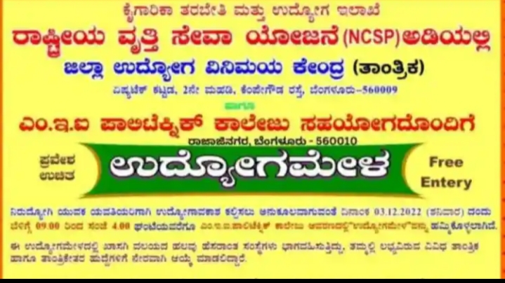 ಕೈಗಾರಿಕಾ ತರಬೇತಿ ಮತ್ತು ಉದ್ಯೋಗ ಇಲಾಖೆ ರಾಷ್ಟ್ರೀಯ ವೃತ್ತಿ ಸೇವಾ ಯೋಜನೆ ಅಡಿಯಲ್ಲಿ ಜಿಲ್ಲಾ ಉದ್ಯೋಗ ವಿನಿಮಯ ಕೇಂದ್ರ (ತಾಂತ್ರಿಕ) ಹಾಗೂ ಎಂ. ಇ.ಐ ಪಾಲಿಟೆಕ್ನಿಕ್ ಕಾಲೇಜು ಸಹಯೋಗದೊಂದಿಗೆ ಉದ್ಯೋಗ ಮೇಳ ಆಯೋಜನೆ ಮಾಡಲಾಗಿದೆ.