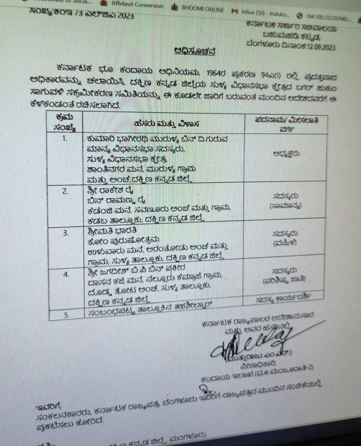 ಸುಳ್ಯ : ಸುಳ್ಯ ವಿಧಾನಸಭಾ ಕ್ಷೇತ್ರದ ಬದರ್ ಹುಕುಂ ಸಾಗುವಳಿ ಸಕ್ರಮೀಕರಣ ಸಮಿತಿಗೆ ಅಧ್ಯಕ್ಷರು ಮತ್ತು ಸದಸ್ಯರನ್ನು ನೇಮಿಸಿ ಸರಕಾರ ಆದೇಶ ಹೊರಡಿದ್ದು, ವಿಶೇಷವೆಂದರೆ ರಾಜ್ಯದಲ್ಲಿ ಕಾಂಗ್ರೆಸ್ ಸರಕಾರ ಇರುವಾಗ ಸುಳ್ಯ ವಿಧಾನಸಭಾ ಕ್ಷೇತ್ರದಲ್ಲಿ ಇದರ ಸದಸ್ಯರು ಬಿಜೆಪಿಗರಾಗಿದ್ದಾರೆ.