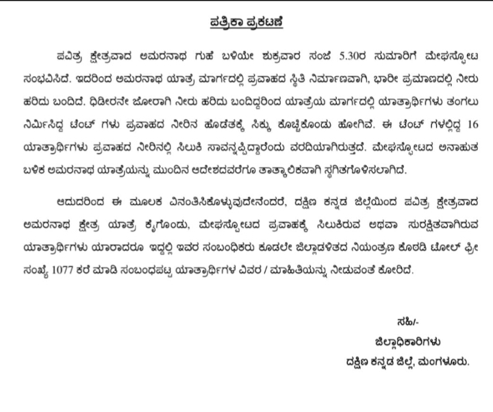 ಆದುದರಿಂದ ಈ ಮೂಲಕ ವಿನಂತಿಸಿಕೊಳ್ಳುವುದೇನೆಂದರೆ, ದಕ್ಷಿಣ ಕನ್ನಡ ಜಿಲ್ಲೆಯಿಂದ ಪವಿತ್ರ ಕ್ಷೇತ್ರವಾದ ಅಮರನಾಥ ಕ್ಷೇತ್ರ ಯಾತ್ರೆ ಕೈಗೊಂಡು, ಮೇಘಸ್ಫೋಟದ ಪ್ರವಾಹಕ್ಕೆ ಸಿಲುಕಿರುವ ಅಥವಾ ಸುರಕ್ತಿತವಾಗಿರುವ ಯಾತ್ರಾರ್ಥಿಗಳು ಯಾರಾದರೂ ಇದ್ದಲ್ಲಿ ಇವರ ಸಂಬಂಧಿಕರು ಕೂಡಲೇ ಜಿಲ್ಲಾಡಳಿತದ ನಿಯಂತ್ರಣ ಕೊಠಡಿ ಟೋಲ್ ಫ್ರೀ ಸಂಖ್ಯೆ 1077 ಕರೆ ಮಾಡಿ ಸಂಬಂಧಪಟ್ಟ ಯಾತ್ರಾರ್ಥಿಗಳ ವಿವರ / ಮಾಹಿತಿಯನ್ನು ನೀಡುವಂತೆ ಕೋರಿದೆ..
