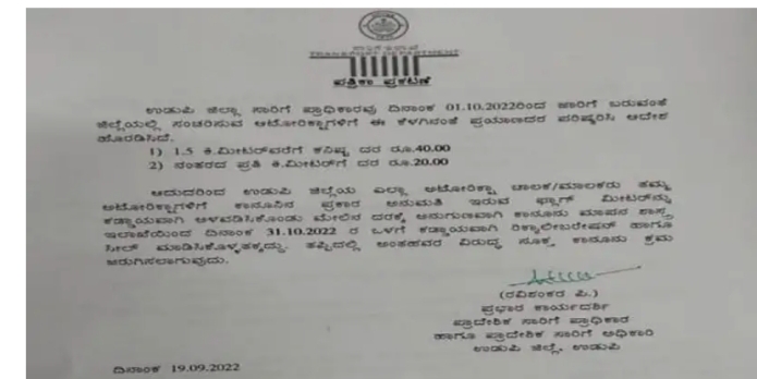 ಉಡುಪಿಯಲ್ಲಿ ಆಟೋ ದರ ಪರಿಷ್ಕರಣೆ ಆಗಲಿದೆ. ಈ ಬಗ್ಗೆ ಪ್ರಕಟಣೆ ಕೂಡಾ ಬಂದಾಗಿದೆ. ಉಡುಪಿ ಜಿಲ್ಲಾ ಸಾರಿಗೆ ಪ್ರಾಧಿಕಾರವು ಅಕ್ಟೋಬರ್ 1 ರಿಂದ ಜಾರಿಗೆ ಬರುವಂತೆ ಜಿಲ್ಲೆಯಾದ್ಯಂತ ಸಂಚರಿಸುವ ಆಟೋರಿಕ್ಷಾಗಳ ಪ್ರಯಾಣ ದರವನ್ನು ಪರಿಷ್ಕರಣೆ