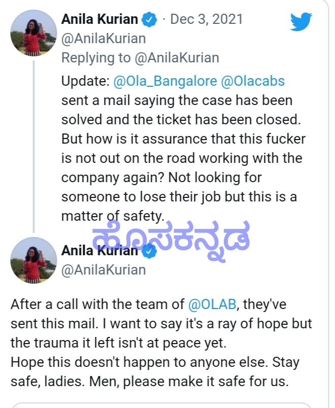ಈ ಬಗ್ಗೆ ತನಗಾದ ಅನುಭವವನ್ನು ಮಹಿಳೆ ಟ್ವಿಟ್ಟರ್ ನಲ್ಲಿ ಹಂಚಿಕೊಂಡಿದ್ದು, ಕೂಡಲೇ ಎಚ್ಚೆತ್ತ ಕ್ಯಾಬ್ ಸಂಸ್ಥೆ ಚಾಲಕನನ್ನು ಕೆಲ್ಸದದಿಂದ ಕಿತ್ತೆಸೆದಿದೆ. ಚಾಲಕನ ಬಂಧನಕ್ಕೆ ಪೊಲೀಸ್ ಆಯುಕ್ತರು ಕ್ರಮ ಕೈಗೊಂಡಿದ್ದಾರೆ ಎಂದು ತಿಳಿದುಬಂದಿದೆ.