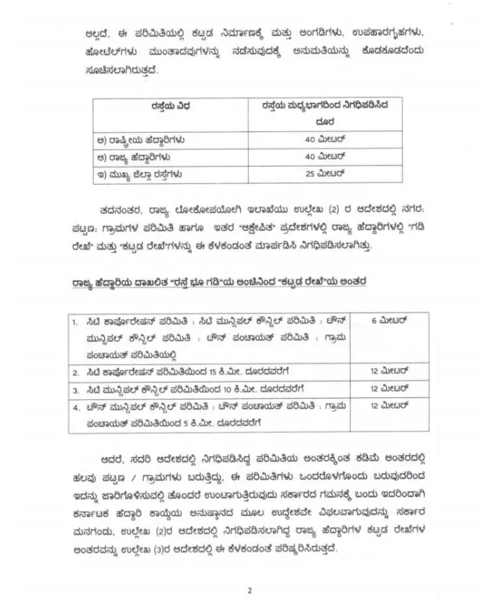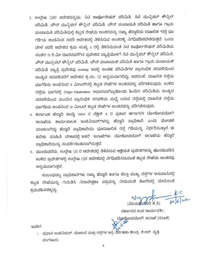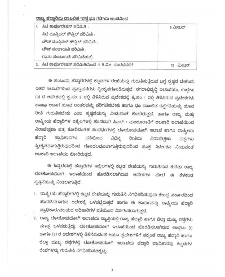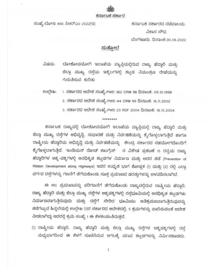 ಐಆರ್ ಸಿ ಪ್ರಮಾಣವನ್ನು ಪರಿಗಣನೆಗೆ ತೆಗೆದುಕೊಂಡು ರಾಜ್ಯದಲ್ಲಿರುವ ರಾಷ್ಟ್ರೀಯ ಹೆದ್ದಾರಿ, ರಾಜ್ಯ ಹೆದ್ದಾರಿ ಮತ್ತು ಜಿಲ್ಲಾ ಮುಖ್ಯ ರಸ್ತೆಗಳ ಅಕ್ಕಪಕ್ಕಗಳಲ್ಲಿ ರಸ್ತೆ ಭೂಮಿಯಲ್ಲಿ ಅನಧಿಕೃತ ಕಟ್ಟಡಗಳು ನಿರ್ಮಾಣವಾಗುತ್ತಿರುವುದು ಮತ್ತು ರಸ್ತೆಗೆ ಸೇರಿದ ಭೂಮಿ ಅತಿಕ್ರಮಣವಾಗುತ್ತಿರುವುದನ್ನು ತಡೆಗಟ್ಟುವ ಹಿನ್ನೆಲೆಯಲ್ಲಿ ರಾಜ್ಯ ಸರ್ಕಾರ ಆದೇಶ ಹೊರಡಿಸಿದ್ದು, ಆದೇಶದಲ್ಲಿ 5 ಕ್ರಮಗಳನ್ನು ಪಾಲಿಸುವಂತೆ ಸೂಚನೆ ನೀಡಿದೆ.