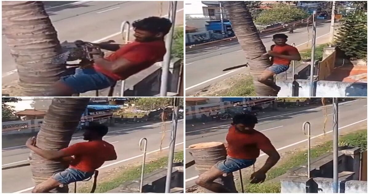 ಅಂದಹಾಗೆ ಸನ್ ಆಫ್ ದಿ ಸಾಯಿಲ್ ಎಂಬ ಟ್ವಿಟ್ಟರ್ ಖಾತೆಯಿಂದ ಅಪ್ಲೋಡ್ ಮಾಡಲಾಗಿರುವ 32 ಸೆಕೆಂಡಿನ, ಈ ವೈರಲ್ ಆದ ವಿಡಿಯೋದಲ್ಲಿ ಮರ ಕುಯ್ಯುವಾತ ಕೆಂಪು ಟೀ ಶರ್ಟ್ , ಜೀನ್ಸ್ ಚೆಡ್ಡಿ ಧರಿಸಿರುವ ಯುವಕನೋರ್ವ ಕಟ್ಟಿಂಗ್ ಮಷಿನ್ ಹಿಡಿದು ತೆಂಗಿನ ಮರವನ್ನು ಏರಿ ಅರ್ಧದಲ್ಲಿ ಕುಳಿತುಕೊಂಡು ಮರವನ್ನು ಕುಯ್ಯಲು ಶುರುಮಾಡುತ್ತಾನೆ. ಮರದ ಕೆಳಗಿನ ರಸ್ತೆಯಲ್ಲಿ ಜನರು, ವಾಹನಗಳು ಓಡಾಡುತ್ತಲೇ ಇರುತ್ತವೆ. ಇದಾವುದರ ಪರಿವು ಅವನಿಗೋರೋಲ್ಲ. ವಿಡಿಯೋ ವೀಕ್ಷಕರಿಗಂತೂ ಮರ ಈಗ ಬೀಳುತ್ತೆ, ಇನ್ನೇನು ಬಿತ್ತು, ಅಯ್ಯೋ ಜನರ ಗತಿಯೇನು ಎಂದು ಭಯ ಆಗೋದು ಮಾತ್ರ ಪಕ್ಕಾ!! ಆದರೆ ಆತ ಕಣ್ಣು ಮುಚ್ಚಿ ಕಣ್ಣು ಬಿಡೋದರೊಳಗೆ ಯಾವುದೋ ಕಡ್ಡಿಯನ್ನು ಮುರಿದಂತೆ ಕತ್ತರಿಸಿ ಕೆಳಕ್ಕೆಸೆಯುತ್ತಾನೆ.