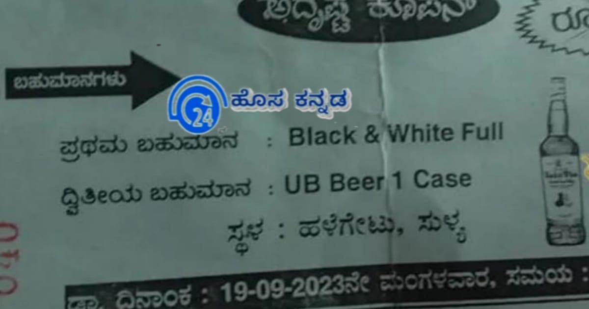 ಜಿಲ್ಲೆಯ ಗಡಿಭಾಗದ ಸುಳ್ಯದಲ್ಲಿ ಗಣೇಶೋತ್ಸವ ಪ್ರಯುಕ್ತ ಲಕ್ಕಿದೀಪ್ (ಅದೃಷ್ಟ ಚೀಟಿ) ಹಾಕಲಾಗಿದ್ದು, ಬಹುಮಾನವಾಗಿ ಮದ್ಯ (ಅಲ್ಕೋಹಾಲ್) ಇರಿಸಿರುವ ವಿಚಾರ ಚರ್ಚೆಗೆ ಕಾರಣವಾಗಿದೆ.