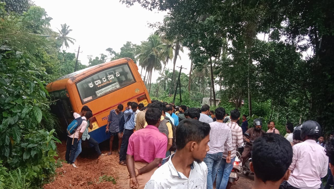 ರಸ್ತೆಯ ಬದಿಯಲ್ಲಿ ಜಲಜೀವನ್ ಯೋಜನೆಯಡಿಯಲ್ಲಿ ಮಣ್ಣು ಅಗೆದು ಪೈಪ್ ಅಳವಡಿಸಲಾಗಿತ್ತು.ಮಳೆ ಬಂದ ಕಾರಣ ಆ ಮಣ್ಣು ಮೆದುವಾಗಿತ್ತು.ಎದುರಿನಿಂದ ಬರುತ್ತಿದ್ದ ಕಾರಿಗೆ ಸೈಡ್ ಕೊಡುವಾಗ ಬಸ್ ರಸ್ತೆಬದಿಗೆ ಚಲಿಸಿದೆ.ರಸ್ತೆ ಬದಿಯಲ್ಲಿ ಮಣ್ಣು ಸಡಿಲಗೊಂಡು ಬಸ್ ಚಾಲಕನ ನಿಯಂತ್ರಣ ಕಳೆದುಕೊಂಡು ಬಸ್ ಚರಂಡಿಗೆ ಬಿದ್ದಿದೆ.