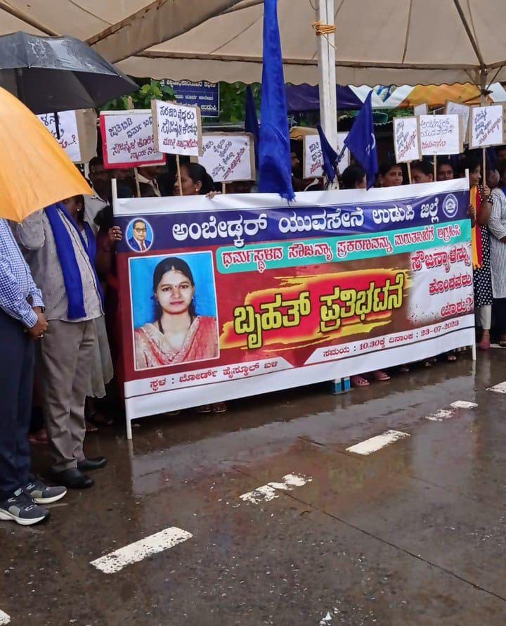 ಧರ್ಮಸ್ಥಳದ ಸೌಜನ್ಯ ಗೌಡ ಅತ್ಯಾಚಾರ ಮತ್ತು ಹತ್ಯಾ ಪ್ರಕರಣದ ಸಂಬಂಧ ರಾಜ್ಯಾದ್ಯಂತ ನಡೆಯುತ್ತಿರುವ ಹೋರಾಟದ ಭಾಗವಾಗಿ ಇವತ್ತು ಉಡುಪಿ ಜಿಲ್ಲೆಯಲ್ಲಿ ಭಾರಿ ಪ್ರತಿಭಟನೆ ನಡೆದಿದೆ. ಉಡುಪಿಯ ಅಂಬೇಡ್ಕರ್ ಯುವ ಸೇನೆ ನೇತೃತ್ವದಲ್ಲಿ ನಡೆದ ಪ್ರತಿಭಟನಾ ಸಭೆಗೆ ಅಂಬೇಡ್ಕರ್ ಯುವ ಸೇನೆ ಸದಸ್ಯರಲ್ಲದೇ ಇತರ ಸಮಾನ ಮನಸ್ಕ ಜನರೂ ಸೇರಿ ಭಾವಹಿಸಿದ್ದು ವಿಶೇಷವಾಗಿತ್ತು.