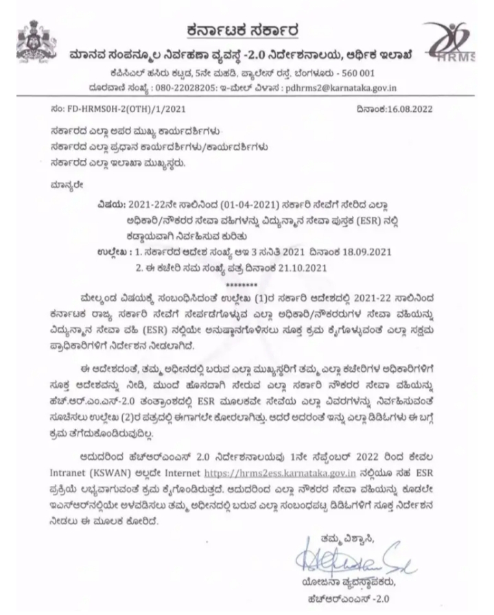 ಈ ಕುರಿತು ರಾಜ್ಯ ಸರ್ಕಾರ ಮಾನವ ಸಂಪನ್ಮೂಲ ನಿರ್ವಹಣಾ ವ್ಯವಸ್ಥೆಯ ಯೋಜನಾ ವ್ಯವಸ್ಥಾಪಕರು ಆದೇಶ ಹೊರಡಿಸಿದ್ದು 2021-22ನೇ ಸಾಲಿನಿಂದ ಕರ್ನಾಟಕ ರಾಜ್ಯ ಸರ್ಕಾರಿ ಸೇವೆಗೆ ಸೇರ್ಪಡೆಗೊಳ್ಳುವ ಎಲ್ಲಾ ಅಧಿಕಾರಿ, ನೌಕರರುಗಳ ಸೇವಾ ವಹಿಯನ್ನು ವಿದ್ಯುನ್ಮಾನ ಸೇವಾ ವಹಿ(ESR) ನಲ್ಲಿಯೇ ಅನುಷ್ಠಾನಗೊಳಿಸಲು ಸೂಕ್ತ ಕ್ರಮ ಕೈಗೊಳ್ಳುವಂತೆ ಎಲ್ಲಾ ಸಕ್ಷಮ ಪ್ರಾಧಿಕಾರಿಗಳಿಗೆ ನಿರ್ದೇಶನ ನೀಡಿದ್ದಾರೆ.