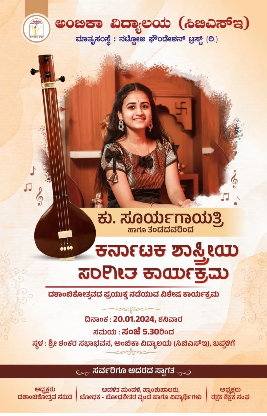 ದಶಾಂಬಿಕೋತ್ಸವದ ಪ್ರಯುಕ್ತ ಖ್ಯಾತ ಯುವಗಾಯಕಿ (Soorya Gayathri) ತಂಡದವರಿಂದ ಕರ್ನಾಟಕ ಶಾಸ್ತ್ರೀಯ ಸಂಗೀತ ಕಾರ್ಯಕ್ರಮವನ್ನು ಜ.20ರಂದು ಆಯೋಜನೆ ಮಾಡಲಾಗಿದೆ. ಅಂಬಿಕಾ ಸಂಸ್ಥೆಯ ಆವರಣದಲ್ಲಿನ ಶ್ರೀ ಶಂಕರ ಸಭಾಭವನದಲ್ಲಿ ಸಂಜೆ 5.30ರಿಂದ ಕಾರ್ಯಕ್ರಮ ಆಯೋಜನೆಗೊಳ್ಳಲಿದೆ.