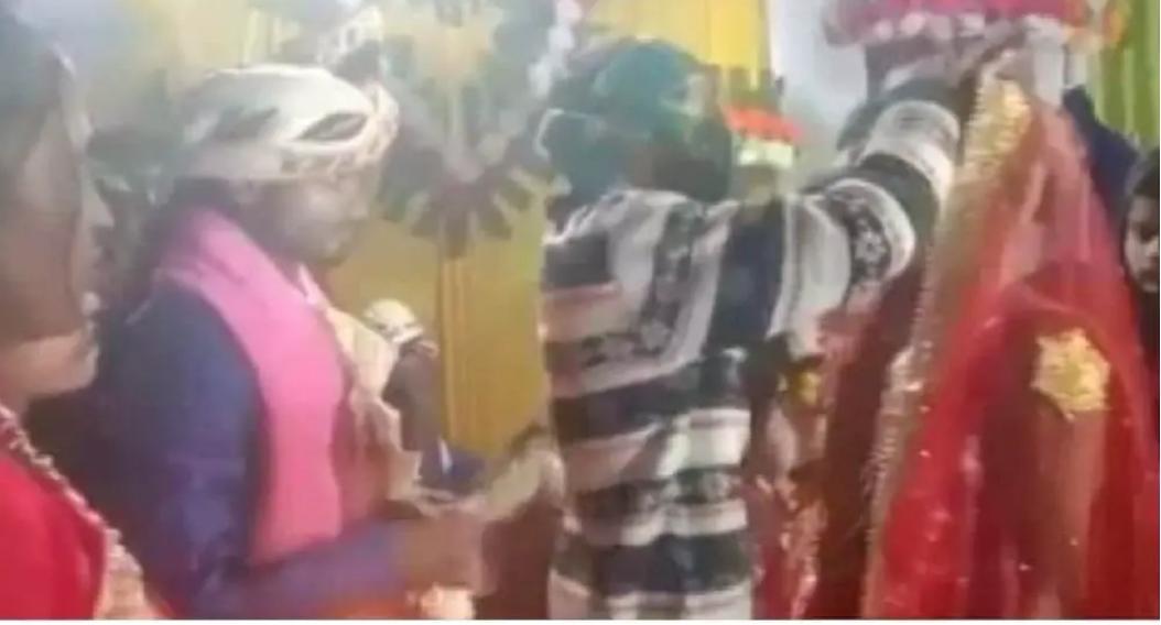 ಈ ವಿಚಿತ್ರವಾದ ಮದುವೆ ಉತ್ತರ ಪ್ರದೇಶದ ಗೋರಖ್ಪುರದ ಬುಧಾತ್ನ ಹರ್ಪುರದಲ್ಲಿ ನಡೆದಿದೆ.ಮದುವೆಯ ಸಮಯದಲ್ಲಿ ವಧು-ವರರು ಹೂವಿನ ಹಾರಗಳನ್ನು ಹಿಡಿದುಕೊಂಡು ಇನ್ನೇನು ಹಾರ ಬದಲಾಯಿಸಿಕೊಳ್ಳಬೇಕು ಎನ್ನುವಷ್ಟರಲ್ಲಿ ಮುಖವನ್ನು ಸ್ಕಾರ್ಫ್ನಲ್ಲಿ ಮುಚ್ಚಿಕೊಂಡ ಯುವಕನೊಬ್ಬ ಮದುವೆ ಮಂಟಪದೊಳಗೆ ಓಡಿಬಂದು ಅಲ್ಲಿದ್ದ ವಧುವಿನ ಹಣೆಗೆ ಸಿಂಧೂರ ಇಟ್ಟಿದ್ದಾನೆ.ಅದನ್ನು ವಿರೋಧಿಸುವ ಆಕೆ ತನ್ನ ಮುಖವನ್ನು ಮುಚ್ಚಿಕೊಂಡು ತಪ್ಪಿಸಿಕೊಳ್ಳಲು ಪ್ರಯತ್ನಿಸಿದರೂ ಬಿಡದ ಆತ ಆಕೆಗೆ ಸಿಂಧೂರ ಇಡುತ್ತಾನೆ.ಲೈವ್ ಆಗಿ ಇದನ್ನು ನೋಡಿದ ವರ ಆಘಾತಕ್ಕೊಳಗಾಗಿದ್ದಾನೆ.ಆ ಮದುವೆ ಮನೆಗೆ ಬಂದಿದ್ದ ವ್ಯಕ್ತಿಯೊಬ್ಬರು ಅಲ್ಲಿ ನಡೆದ ಸಂಪೂರ್ಣ ಘಟನೆಯನ್ನು ರೆಕಾರ್ಡ್ ಮಾಡಿಕೊಂಡಿದ್ದಾರೆ. ಆ ವಿಡಿಯೋ ಸೋಷಿಯಲ್ ಮೀಡಿಯಾದಲ್ಲಿ ಭಾರೀ ವೈರಲ್ ಆಗುತ್ತಿದೆ.