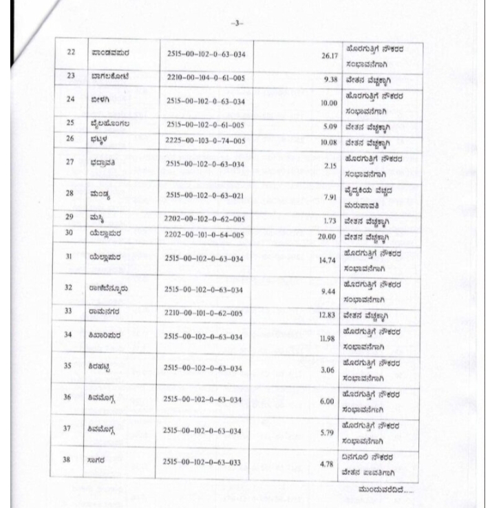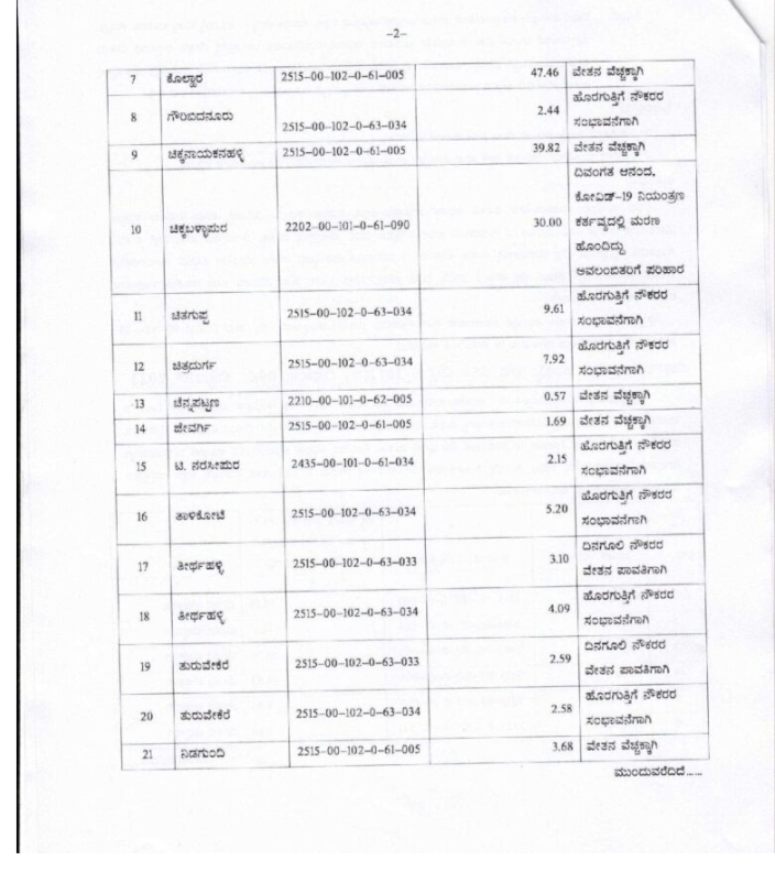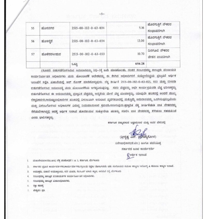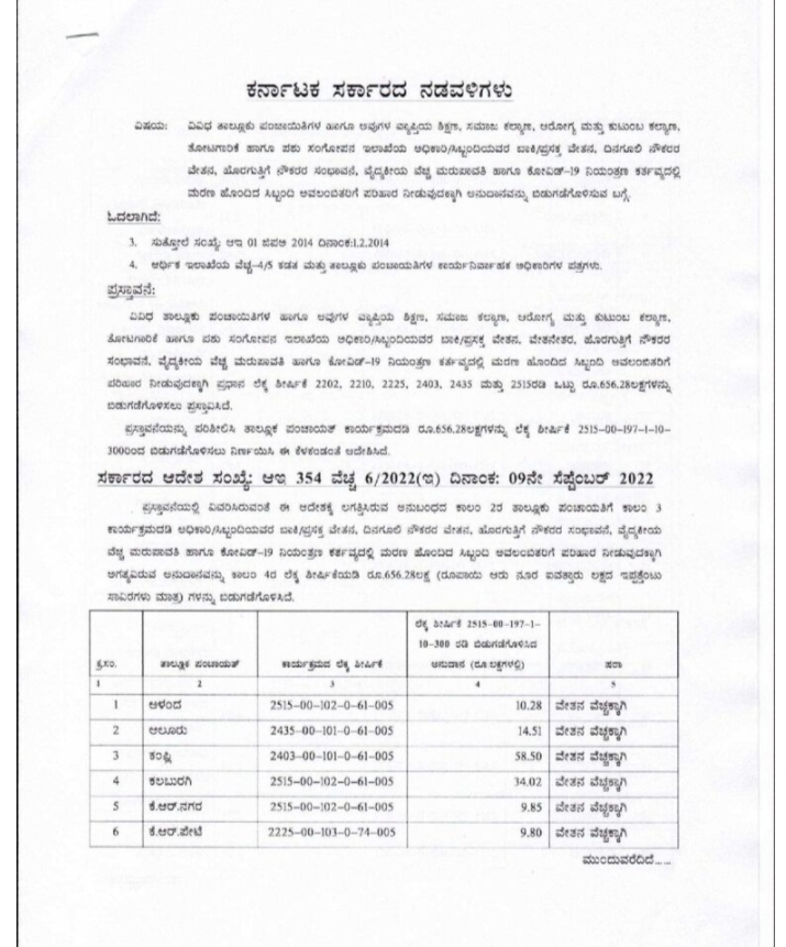 ಈ ಕುರಿತಂತೆ ಆರ್ಥಿಕ ಇಲಾಖೆಯ ಸರ್ಕಾರದ ಜಂಟಿ ಕಾರ್ಯದರ್ಶಿ ನಡವಳಿ ಹೊರಡಿಸಿದ್ದು, ತಾಲೂಕು ಪಂಚಾಯ್ತಿಗಳಲ್ಲಿ ವಿವಿಧ ಕಾರ್ಯಕ್ರಮದಡಿ ಅಧಿಕಾರಿ, ಸಿಬ್ಬಂದಿಯವರ ಬಾಕಿ, ಪ್ರಸಕ್ತ ವೇತನ, ದಿನಗೂಲಿ ನೌಕರರ ವೇತನ, ಹೊರಗುತ್ತಿಗೆ ನೌಕರರ ಸಂಭಾವನೆ, ವೈದ್ಯಕೀಯ ವೆಚ್ಚ ಮರುಪಾವತಿಗೆ ಅನುದಾನ ಬಿಡುಗಡೆ ಮಾಡಲಾಗಿದೆ ಎಂದಿದ್ದಾರೆ.