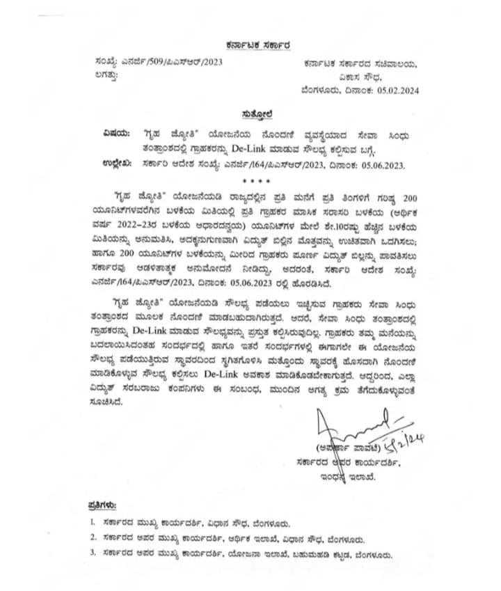 Gruha Jyoti: ಕಾಂಗ್ರೆಸ್ ಸರಕಾರದ ಮಹತ್ತರ ಗ್ಯಾರಂಟಿ ಯೋಜನೆಗಳಲ್ಲಿ ಒಂದಾದ ಗೃಹಜ್ಯೋತಿ ಕುರಿತು ಮಹತ್ವದ ಮಾಹಿತಿಯೊಂದು ಹೊರಬಿದ್ದಿದೆ. ಸೇವಾಸಿಂಧು ತಂತ್ರಾಂಶದಲ್ಲಿ ಗ್ರಾಹಕರನ್ನು De-Link ಮಾಡುವ ಸೌಲಭ್ಯ ಕಲ್ಪಿಸುವ ಕುರಿತು ರಾಜ್ಯ ಸರಕಾರ ಮಹತ್ವದ ಮಾಹಿತಿಯೊಂದನ್ನು ನೀಡಿದೆ.