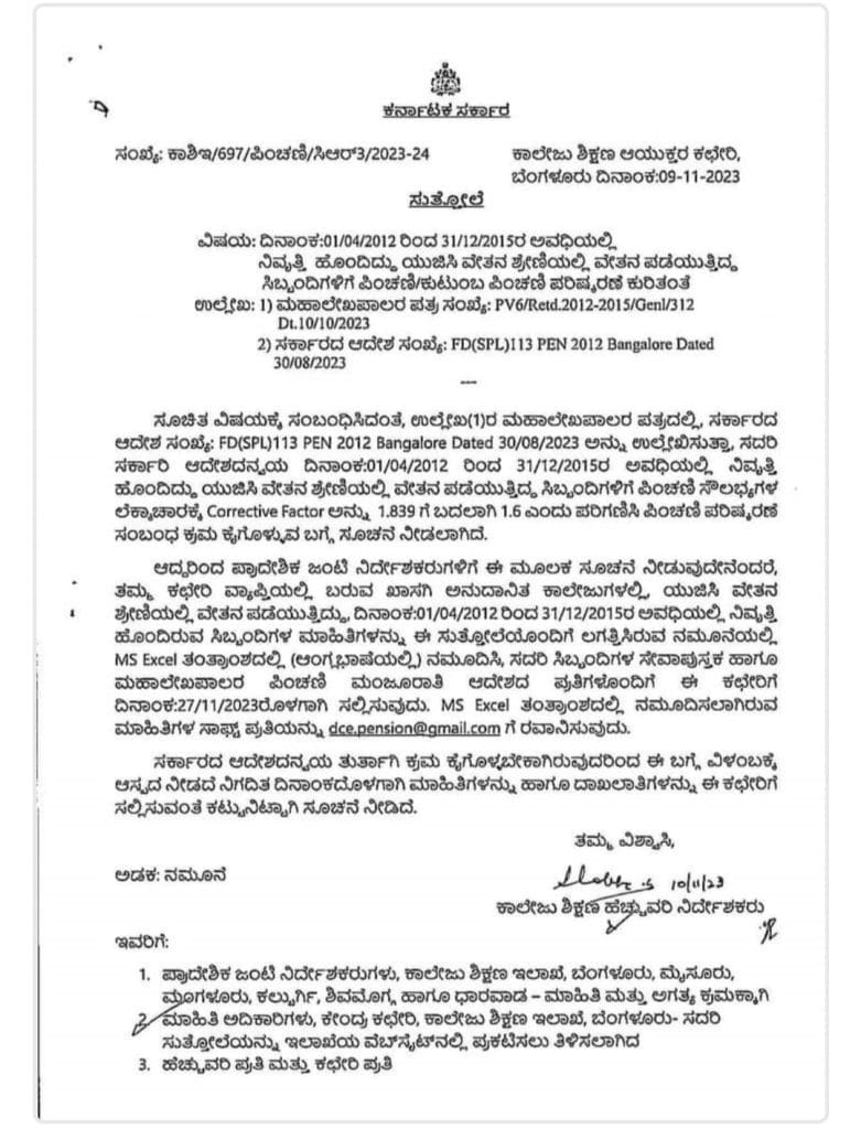 ಕಾಲೇಜು ಶಿಕ್ಷಣ ಇಲಾಖೆಯ ಹೆಚ್ಚುವರಿ ನಿರ್ದೇಶಕರು ಈ ಕುರಿತು ಸುತ್ತೋಲೆ ಹೊರಡಿಸಿದ್ದು, ಸರ್ಕಾರಿ ಆದೇಶದನ್ವಯ 0:01/04/2012 31/12/2015ರ ಅವಧಿಯಲ್ಲಿ ನಿವೃತ್ತಿ ಹೊಂದಿದ್ದು ಯುಜಿಸಿ ವೇತನ ಶ್ರೇಣಿಯಲ್ಲಿ ವೇತನ ಪಡೆಯುತ್ತಿದ್ದ ಸಿಬ್ಬಂದಿಗಳಿಗೆ ಪಿಂಚಣಿ ಸೌಲಭ್ಯಗಳ ಲೆಕ್ಕಾಚಾರಕ್ಕೆ Corrective Factor ಅನ್ನು 1.839 ಗೆ ಬದಲಿಗೆ 1.6 ಎಂದು ಪರಿಗಣಿಸಿ ಪಿಂಚಣಿ ಪರಿಷ್ಕರಣೆ ಕುರಿತು ಕ್ರಮ ಕೈಗೊಳ್ಳುವ ಸೂಚನೆ ನೀಡಲಾಗಿದೆ.
