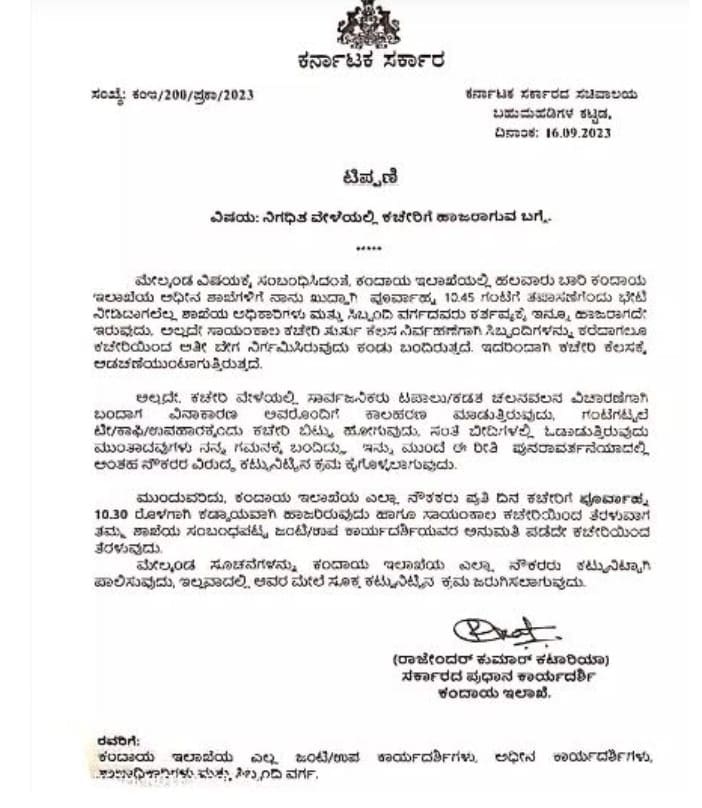ನೌಕರರು ಪ್ರತಿದಿನ ಬೆಳಗ್ಗೆ 10.30 ರೊಳಗಾಗಿ ಕಡ್ಡಾಯವಾಗಿ ಕಚೇರಿಯಲ್ಲಿ ಹಾಜರಿರಬೇಕು. ಸಂಜೆ ಕಚೇರಿಯಿಂದ ತೆರಳುವ ಸಮಯದಲ್ಲಿ ಸಂಬಂಧಪಟ್ಟ ಶಾಖೆಯ ಜಂಟಿ/ಉಪಕಾರ್ಯದರ್ಶಿ ಅನುಮತಿ ಪಡೆದು ತೆರಳಬೇಕೆಂದು ಕಂದಾಯ ಇಲಾಖೆಯ ಎಲ್ಲಾ ನೌಕರರಿಗೆ ಕಂದಾಯ ಇಲಾಖೆಯ ಪ್ರಧಾನ ಕಾರ್ಯದರ್ಶಿ ರಾಜೇಂದರ್ ಕುಮಾರ್ ಕಟಾರಿಯಾ ಸೂಚನೆ ನೀಡಿದ್ದಾರೆ.