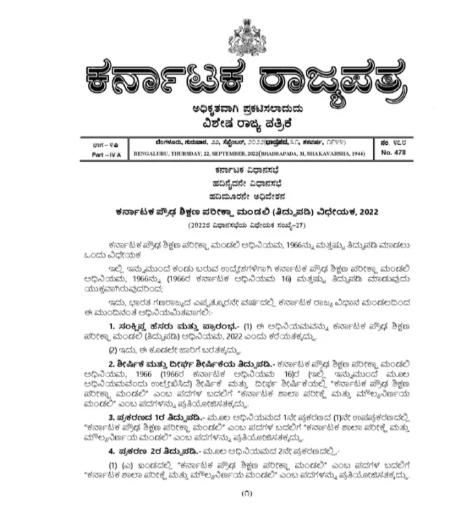 ಈ ಕುರಿತಂತೆ ರಾಜ್ಯ ಸರ್ಕಾರದಿಂದ ವಿಶೇಷ ರಾಜ್ಯ ಪತ್ರಿಕೆ ಹೊರಡಿಸಲಾಗಿದ್ದು, ಕರ್ನಾಟಕ ಪ್ರೌಢ ಶಿಕ್ಷಣ ಪರೀಕ್ಷಾ ಮಂಡಳಿ (ತಿದ್ದುಪಡಿ ) ಅಧಿನಿಯಮಕ್ಕೆ ತಿದ್ದುಪಡಿಯನ್ನು ತರಲಾಗಿದೆ. ಅದರನುಸಾರ ಇನ್ಮುಂದೆ ಮೂಲ ಅಧಿನಿಯಮದಲ್ಲಿದ್ದಂತ ಕರ್ನಾಟಕ ಪ್ರೌಢ ಶಿಕ್ಷಣ ಪರೀಕ್ಷಾ ಮಂಡಳಿ ಬದಲಿಗೆ “ಕರ್ನಾಟಕ ಶಾಲಾ ಪರೀಕ್ಷೆ ಮತ್ತು ಮೌಲ್ಯನಿರ್ಣಯ ಮಂಡಳಿ” ಎಂಬ ಪದಗಳನ್ನು ಪ್ರತಿಯೋಜಿಸುವಂತೆ ತಿಳಿಸಲಾಗಿದೆ.