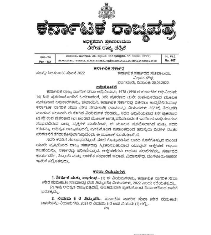 ಕರ್ನಾಟಕ ರಾಜ್ಯ ನಾಗರಿಕ ಸೇವಾ ಅಧಿನಿಯಮ, 1978 (1990 ರ ಕರ್ನಾಟಕ ಅಧಿನಿಯಮ (14) 8ನೇ ಪುಕರಣದೊಂದಿಗೆ ಓದಲಾದಂತೆ, 3ನೇ ಪ್ರಕರಣದ (1)ನೇ ಉಪ-ಪಕರಣದ ಮೂಲಕ ಪದತ್ತವಾದ ಅಧಿಕಾರಗಳನ್ನು ಚಲಾಯಿಸಿ, ಕರ್ನಾಟಕ ಸರ್ಕಾರವು ರಚಿಸಲು ಉದ್ದೇಶಿಸಿರುವಂಥ ಕರ್ನಾಟಕ ನಾಗರಿಕ ಸೇವಾ (ನೇರ ನೇಮಕಾತಿ) (ಸಾಮಾನ್ಯ) ನಿಯಮಗಳು 2021ಕ್ಕೆ ತಿದ್ದುಪಡಿ ಮಾಡುವ ಸಲುವಾಗಿ ಈ ಕೆಳಗಿನ ನಿಯಮಗಳ ಕರಡನ್ನು, ಸದರಿ ಅಧಿನಿಯಮದ 3ನೇ ಪ್ರಕರಣದ (2) ನೇ ಉಪ ಪುಕರಣದ (ಎ) ಖಂಡದ ಮೂಲಕ ಅಗತ್ಯಪಡಿಸಲಾದಂತೆ ಇದರಿಂದ ಬಾಧಿತರಾಗುವ ಸಂಭವವಿರುವ ಎಲ್ಲಾ ವ್ಯಕ್ತಿಗಳ ಮಾಹಿತಿಗಾಗಿ, ಈ ಮೂಲಕ ಪ್ರಕಟಿಸಲಾಗಿದೆ ಮತ್ತು ಸದರಿ ಕರಡನ್ನು ಅಧಿಕೃತ ರಾಜ್ಯಪತ್ರದಲ್ಲಿ ಪ್ರಕಟಗೊಂಡ ದಿನಾಂಕದಿಂದ ಹದಿನೈದು ದಿನಗಳ ನಂತರ ಪರಿಗಣನೆಗೆ ತೆಗೆದುಕೊಳ್ಳಲಾಗುವುದೆಂದು ಈ ಮೂಲಕ ಸೂಚಿಸಲಾಗಿದೆ.
