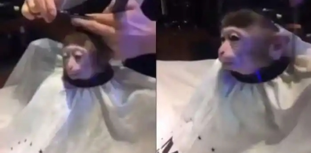 45 ಸೆಕೆಂಡುಗಳ ಕ್ಲಿಪ್ನಲ್ಲಿ, ಕೋತಿ ಸಲೂನ್ನಲ್ಲಿ ಕನ್ನಡಿಯ ಮುಂದೆ ಕುರ್ಚಿಯ ಮೇಲೆ ಕುಳಿತಿರುವುದು ಕಂಡುಬರುತ್ತದೆ. ಅವನ ಕಾಲರ್ಗೆ ಬಟ್ಟೆಯನ್ನು ಸುತ್ತಿಕೊಂಡಿದ್ದಾನೆ. ಕ್ಷೌರಿಕ ಮಂಗನ ಕೂದಲನ್ನು ಬಾಚುತ್ತಾರೆ ಮತ್ತು ನಂತರ ಅವುಗಳನ್ನು ಎಲೆಕ್ಟ್ರಿಕ್ ಟ್ರಿಮ್ಮರ್ನಿಂದ ಟ್ರಿಮ್ ಮಾಡಲು ಪ್ರಾರಂಭಿಸುತ್ತಾರೆ. ಕ್ಷೌರಿಕ ತನ್ನ ಕೆಲಸವನ್ನು ಮಾಡುವಾಗ ಕೋತಿ ತಾಳ್ಮೆಯಿಂದ ಕುಳಿತುಕೊಳ್ಳುತ್ತದೆ.