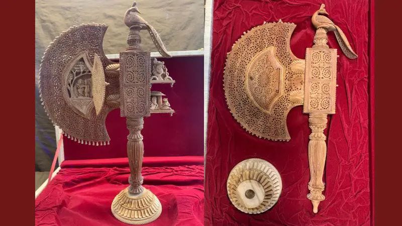 ಶುದ್ಧ ಶ್ರೀಗಂಧದ ಮರದಿಂದ ಮಾಡಿದ ‘ಕೃಷ್ಣ ಪಂಖಿ’ ಕಲಾಕೃತಿಯನ್ನು ಉಡುಗೊರೆಯಾಗಿ ಕೊಟ್ಟಿದ್ದಾರೆ. ಈ ಕಲಾಕೃತಿಯನ್ನು ಸಾಂಪ್ರದಾಯಿಕ ಉಪಕರಣಗಳೊಂದಿಗೆ ತಯಾರಿಸಲಾಗಿದ್ದು, ಕಲಾಕೃತಿಯ ಮೇಲ್ಭಾಗದಲ್ಲಿ ನವಿಲಿನ ಚಿತ್ರವಿದೆ. ಕಲಾಕೃತಿಯು ಕೃಷ್ಣನ ವಿವಿಧ ಭಂಗಿಗಳನ್ನು ಹೊಂದಿದೆ. ಭಾರತದ ರಾಷ್ಟ್ರೀಯ ಪಕ್ಷಿಯಾದ ಮೇಲ್ಭಾಗದಲ್ಲಿ ಕೈಯಿಂದ ಕೆತ್ತಿದ ನವಿಲು ಆಕೃತಿಯನ್ನು ಹೊಂದಿದೆ.