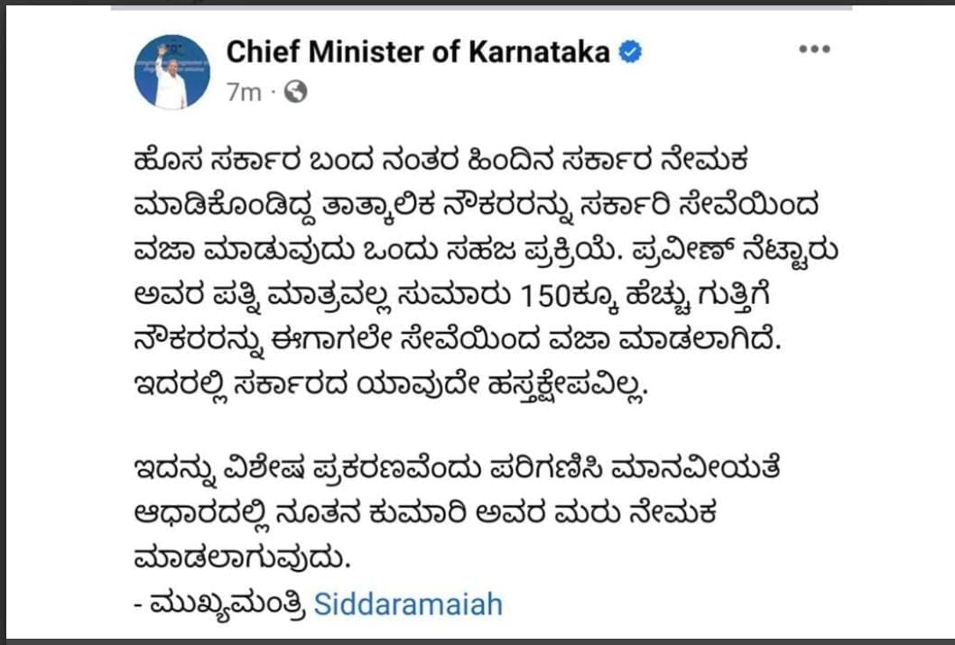 ಪ್ರವೀಣ್ ನೆಟ್ಟಾರು ಅವರ ಪತ್ನಿ ಮಾತ್ರವಲ್ಲ ಸುಮಾರು 150 ಕ್ಕೂ ಹೆಚ್ಚು ಗುತ್ತಿಗೆ ನೌಕರರನ್ನು ಈಗಾಗಲೇ ಸರ್ಕಾರಿ ಸೇವೆಯಿಂದ ವಜಾ ಮಾಡಲಾಗಿದೆ. ಇದರಲ್ಲಿ ನಮ್ಮ ಸರ್ಕಾರದ ಯಾವುದೇ ಹಸ್ತಕ್ಷೇಪವಿಲ್ಲ. ಇದನ್ನು ಒಂದು ವಿಶೇಷ ಪ್ರಕರಣವೆಂದು ಮಾನವೀಯತೆ ಆಧಾರದಲ್ಲಿ ನೂತನ ಕುಮಾರಿ ಅವರ ಮರು ನೇಮಕ ಮಾಡಲಾಗುವುದು ಎಂಬುದಾಗಿ ತಿಳಿಸಿದ್ದಾರೆ. ಘಟನೆಗೆ ಕ್ಷಿಪ್ರವಾಗಿ ಸ್ಪಂದಿಸಿದ ಸಿದ್ದರಾಮಯ್ಯನವರಿಗೆ ಒಂದು ಶಹಬಾಸ್.