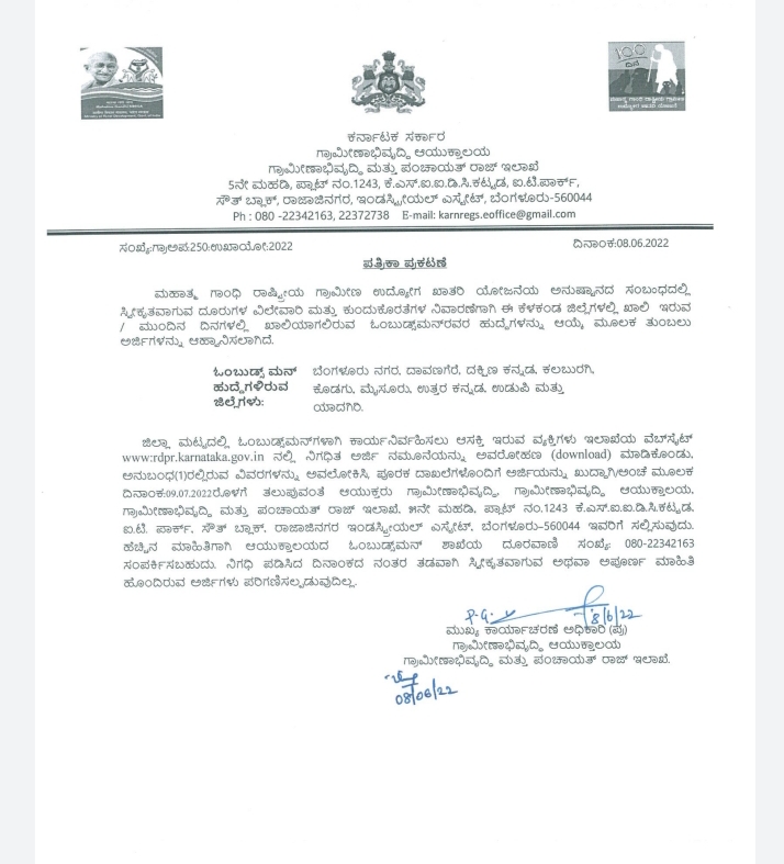 ಕರ್ನಾಟಕ ಗ್ರಾಮೀಣಾಭಿವೃದ್ಧಿ ಮತ್ತು ಪಂಚಾಯತ್ ರಾಜ್ ಇಲಾಖೆ ನೇಮಕಾತಿ ಭರ್ತಿಗೆ ಮುಂದಾಗಿದೆ. 9 ಒಂಬುಡ್ಸ್ ಮನ್ ಹುದ್ದೆಗಳ ಭರ್ತಿಗೆ ಮುಂದಾಗಿದೆ. ಈ ಸಂಬಂಧ ಇಲಾಖೆ ಅಧಿಸೂಚನೆ ಹೊರಡಿಸಿದ್ದು, ಯಾವುದೇ ಪದವಿ ಅಭ್ಯರ್ಥಿಗಳು ಅರ್ಜಿ ಸಲ್ಲಿಸಬಹುದಾಗಿದೆ.