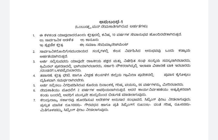 ಅನುಭವ: ಈ ಹುದ್ದೆಗೆ ಸೇವೆ ಸಲ್ಲಿಸುವ ಅಭ್ಯರ್ಥಿಗಳು ಸಾರ್ವಜನಿಕ ಆಡಳಿತ, ಕಾನೂನು, ಶೈಕ್ಷಣಿಕ ಕ್ಷೇತ್ರ ಅಥವಾ ಸಮಾಜ ಸೇವೆ/ ನಿರ್ವಹಣೆ ಕ್ಷೇತ್ರದಲ್ಲಿ 10 ವರ್ಷಗಳ ಸೇವಾನುಭವ ಹೊಂದಿರಬೇಕಾಗಿದೆ.