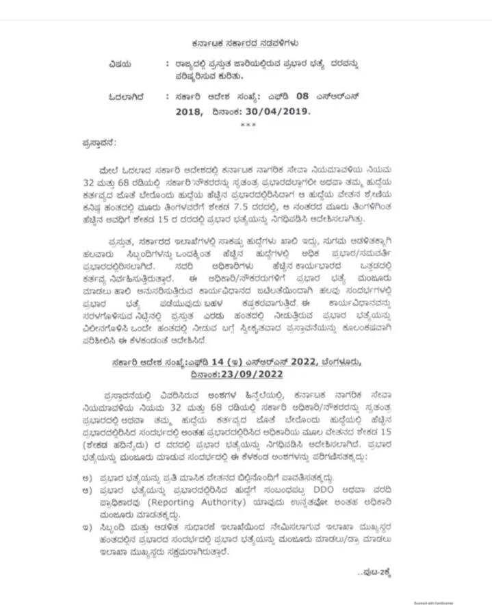 “ಸರ್ಕಾರಿ ನೌಕರರನ್ನು ಸ್ವತಂತ್ರ ಪ್ರಭಾರದಲ್ಲಾಗಲೀ ಅಥವಾ ತಮ್ಮ ಹುದ್ದೆಯ ಕರ್ತವ್ಯದ ಜೊತೆಗೆ ಬೇರೊಂದು ಹುದ್ದೆಯ ಹೆಚ್ಚಿನ ಪ್ರಭಾರದಲ್ಲಿರಿಸಿದಾಗ, ಆ ಹುದ್ದೆಯ ವೇತನ ಶ್ರೇಣಿಯ ಕನಿಷ್ಠ ಹಂತದಲ್ಲಿ ಮೂರು ತಿಂಗಳವರೆಗೆ ಶೇ.7.5 ದರದಲ್ಲಿ, ಆ ನಂತರದ ಮೂರು ತಿಂಗಳಿಗಿಂತ ಹೆಚ್ಚಿನ ಅವಧಿಗೆ ಶೇ.15ರ ದರದಲ್ಲಿ ಪ್ರಭಾರ ಭತ್ಯೆಯನ್ನು ನಿಗದಿಪಡಿಸಿ, ಆದೇಶಿಸಲಾಗಿತ್ತು ಎಂದಿದ್ದಾರೆ. ಈ ಸಂಬಂಧ ಆರ್ಥಿಕ ಇಲಾಖೆಯ ಸರ್ಕಾರದ ಅಧೀನ ಕಾರ್ಯದರ್ಶಿ ನಡವಳಿಗಳನ್ನು ಹೊರಡಿಸಿದ್ದಾರೆ.