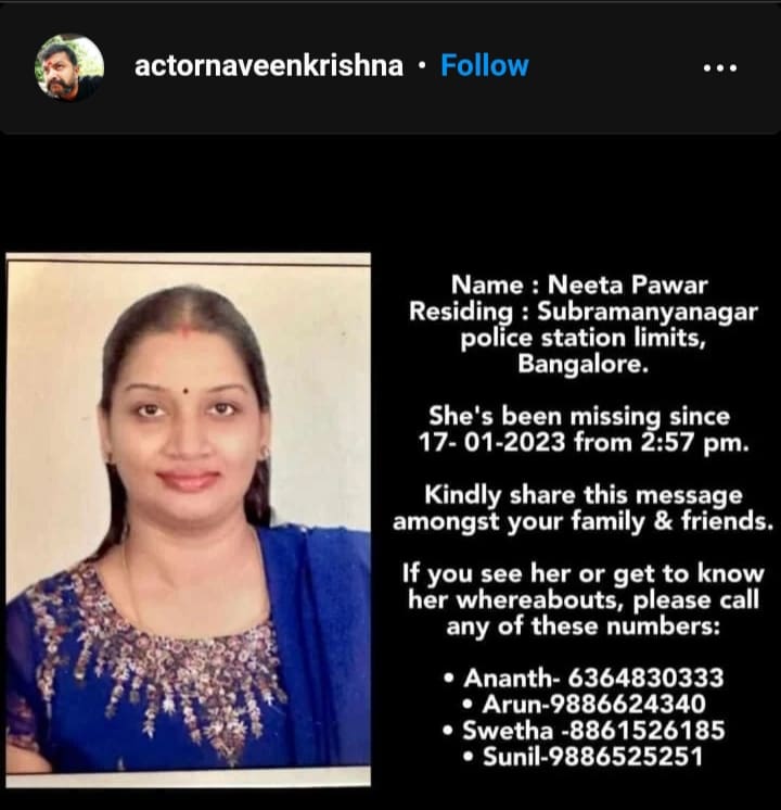 ಬೆಂಗಳೂರಿನ ಸುಬ್ರಮಣ್ಯಪುರ ಪೊಲೀಸ್ ಠಾಣೆ ವ್ಯಾಪ್ತಿಯಲ್ಲಿ ವಾಸವಾಗಿದ್ದ ನೀತಾ ಪವಾರ್ ಜನವರಿ 17 ರಂದು ಮಧ್ಯಾಹ್ನ 2:57ಕ್ಕೆ ಮನೆಯಿಂದ ಹೊರ ಹೋದವರು ವಾಪಸ್ ಬಂದಿಲ್ಲ. ದಯವಿಟ್ಟು ಕಂಡರೆ ತಿಳಿಸಿ ಎಂದು ಹೇಳಿದ್ದಾರೆ. ಈ ಮಾಹಿತಿಯನ್ನು ಇತರರೊಂದಿಗೆ ಹಂಚಿಕೊಳ್ಳಿ ಎಂದು ಕೇಳಿಕೊಂಡಿದ್ದಾರೆ. ಜೊತೆಗೆ ಒಂದಿಷ್ಟು ಫೋನ್ ನಂಬರ್ಗಳನ್ನು ನೀಡಿದ್ದಾರೆ.