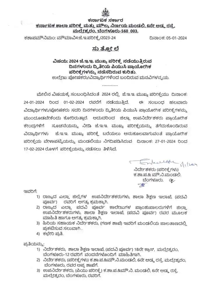 ಹಲವಾರು ವಿದ್ಯಾರ್ಥಿಗಳು/ಪೋಷಕರು ಸದರಿ ದಿನಗಳಂದು ದ್ವಿತೀಯ ಪಿಯುಸಿ ಪ್ರಾಯೋಗಿಕ ಪರೀಕ್ಷೆಗಳನ್ನು ಮುಂದೂಡಬೇಕೆಂದು ಮನವಿ ಮಾಡಿದ ಹಿನ್ನೆಲೆ ಜಿಲ್ಲಾ ಉಪನಿರ್ದೇಶಕರು ಪ್ರಾಯೋಗಿಕ ಕೇಂದ್ರಗಳಿಗೆ ಸೂಚನೆಯನ್ನು ನೀಡಿದೆ. ಪೋಷಕರು/ವಿದ್ಯಾರ್ಥಿಗಳಿಂದ ಬಂದಿರುವ ಮನವಿಯ ಮೇರೆಗೆ 2024 ರಲ್ಲಿ ಜೆ.ಇ.ಇ.ಮುಖ್ಯ ಪರೀಕ್ಷೆಯು 24-01-2024 ರಿಂದ 01-02-2024 ರವರೆಗೆ ನಡೆಯಲಿದೆ.