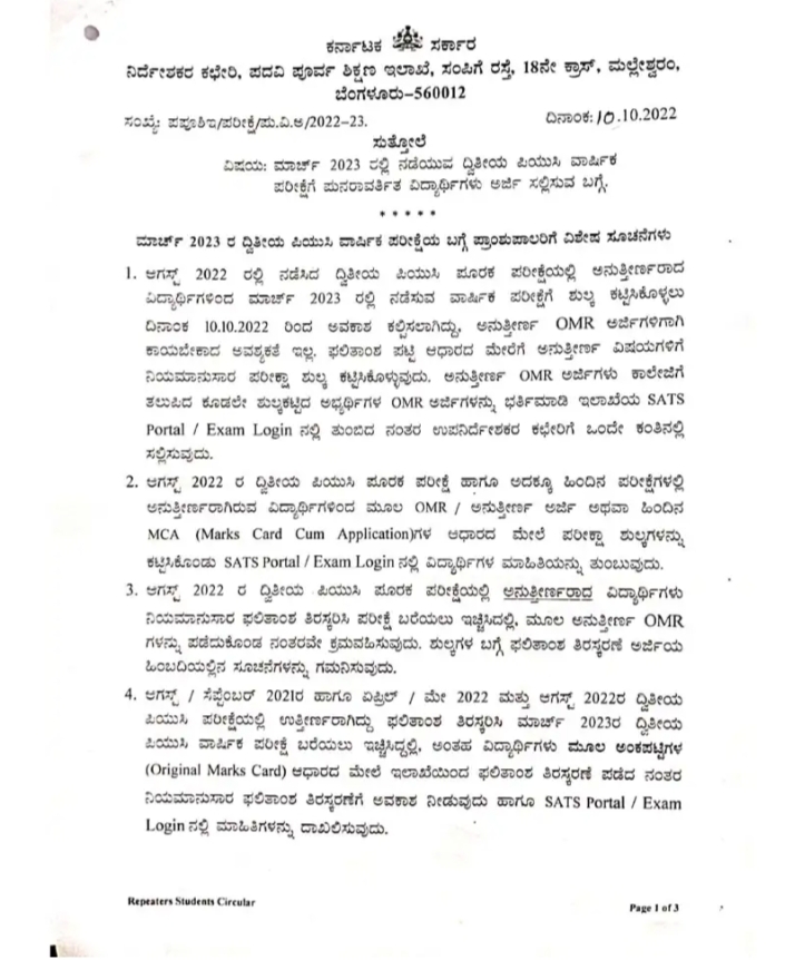ಪದವಿ ಪೂರ್ವ ಶಿಕ್ಷಣ ಇಲಾಖೆಯು ಮಾರ್ಚ್ 2023 ರಲ್ಲಿ ನಡೆಯುವ ದ್ವಿತೀಯ ಪಿಯುಸಿ ವಾರ್ಷಿಕ ಪರೀಕ್ಷೆಗೆ ಪುನರಾವರ್ತಿತ ವಿದ್ಯಾರ್ಥಿಗಳು ಅರ್ಜಿ ಸಲ್ಲಿಸುವ ಕುರಿತು ಸುತ್ತೋಲೆ ಹೊರಡಿಸಿದೆ.