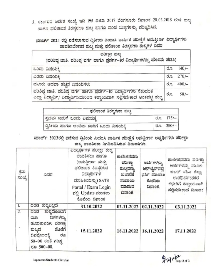 ಪುನರಾವರ್ತಿತ ವಿದ್ಯಾರ್ಥಿಗಳು ಅರ್ಜಿ ಸಲ್ಲಿಸುವ ಕುರಿತು, ಮಾರ್ಚ್ 2023 ರಲ್ಲಿ ನಡೆಸಲಾಗುವ ದ್ವಿತೀಯ ಪಿಯಸಿ ವಾರ್ಷಿಕ ಪರೀಕ್ಷೆಗೆ ಅನುತ್ತೀರ್ಣ ವಿದ್ಯಾರ್ಥಿಗಳು ಪಾವತಿಸಬೇಕಾದ ಶುಲ್ಕ ಮತ್ತು ಫಲಿತಾಂಶ ತಿರಸ್ಕರಣಾ ಶುಲ್ಕಗಳ ಮಾಹಿತಿಯನ್ನು ಪದವಿ ಪೂರ್ವ ಶಿಕ್ಷಣ ಇಲಾಖೆ ಪ್ರಕಟಿಸಿದೆ.