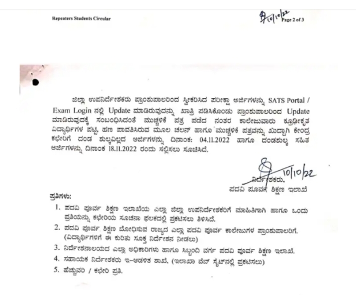 ದಂಡ ಶುಲ್ಕವಿಲ್ಲದೇ ವಿದ್ಯಾರ್ಥಿಗಳ ಪರೀಕ್ಷಾ ಶುಲ್ಕ ಪಾವತಿಗೆ 31-10-2022 ಕೊನೆಯ ದಿನಾಂಕವಾಗಿದ್ದು, ಹೆಚ್ಚಿನ ಮಾಹಿತಿಗಾಗಿ ಇಲಾಖೆಯ ಅಧಿಕೃತ ಅಧಿಸೂಚನೆಯನ್ನು ನೋಡಬಹುದಾಗಿದೆ.