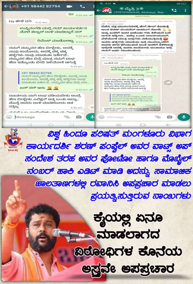 ಮೊನ್ನೆಯ ದಿನ ಉಪ್ಪಿನಂಗಡಿಯಲ್ಲಿ ನಡೆದ ತಲವಾರು ದಾಳಿ ವಿಚಾರದಲ್ಲಿ ಕಾರ್ಯಕರ್ತರೆಂದು ವಾಟ್ಸಪ್ ನಲ್ಲಿ ಮೆಸೇಜ್ ಮಾಡಿದ್ದ ವ್ಯಕ್ತಿಯೋರ್ವರಿಗೆ,ಉತ್ತರವೊಂದು ಬಂದಿದ್ದು, ಅದರಲ್ಲಿ “ನಮಗೆ ನಮ್ಮವರ ಹೆಣ ಬೀಳ್ಬೇಕು, ಆಗ ಮಾತ್ರ ನಾವು ಬೀದಿಗೆ ಇಳಿಯಲು ಸಾಧ್ಯ, ಮೊನ್ನೆಯ ದಾಳಿಯಲ್ಲಿ ಆತ ಸತ್ತಿಲ್ಲ. ಎಲೆಕ್ಷನ್ ಹತ್ತಿರ ಬರುತ್ತಿರುವಾಗ ಇದೆಲ್ಲಾ ಬೇಕು, ಅದಕ್ಕಾಗಿಯೇ ನಾವೂ ಸಣ್ಣಪುಟ್ಟ ಹಲ್ಲೆಗಳನ್ನು ನಡೆಸುತ್ತಿದ್ದೇವೆ” ಇದು ಸಾಮಾಜಿಕ ಜಾಲತಾಣದಲ್ಲಿ ಹರಿದಾಡುತ್ತಿದ್ದೂ, ಶರಣ್ ಪಂಪ್ ವೆಲ್ ಅವರೇ ಈ ರೀತಿಯ ಹೇಳಿಕೆ ನೀಡಿದ್ದಾರೆ ಎಂದು ಬಿಂಬಿಸಲಾಗಿತ್ತು.