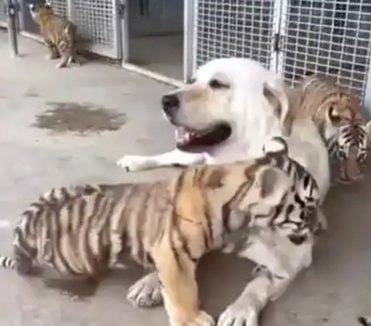 ಲಾಬ್ರಡರ್​ ತಳಿಯ ನಾಯಿಯು, ಮೃಗಾಲಯದಲ್ಲಿ ತಾಯಿಯಿಂದ ಬೇರೆಯಾಗಿರುವ ಮೂರು ಹುಲಿ ಮರಿಗಳನ್ನು ಪೋಷಿಸುತ್ತಿದ್ದು, ನಾಯಿ ಮತ್ತು ಹುಲಿ ಮರಿಗಳ ನಡುವಿನ ಬಾಂದವ್ಯವನ್ನು ನೋಡಿ ನೆಟ್ಟಿಗರು ಫಿದಾ ಆಗಿದ್ದಾರೆ. ಈ ವಿಡಿಯೋವನ್ನು ಚೀನಾದಲ್ಲಿ ಸೆರೆಹಿಡಿಯಲಾಗಿದ್ದು, ನಾಯಿಯ ಸುತ್ತಲೂ ಹುಲಿ ಮರಿಗಳು ಆಟವಾಡುತ್ತಿರುವ ದೃಶ್ಯ ವಿಡಿಯೋದಲ್ಲಿದೆ. ಈ ಮರಿಗಳು ಹುಟ್ಟಿದ ಕೂಡಲೇ ತಾಯಿ ಹುಲಿ ಅವುಗಳಿಗೆ ಆಹಾರವನ್ನು ನೀಡಲು ನಿರಾಕರಿಸಿತು ಎಂದು ಹೇಳಲಾಗಿದೆ.