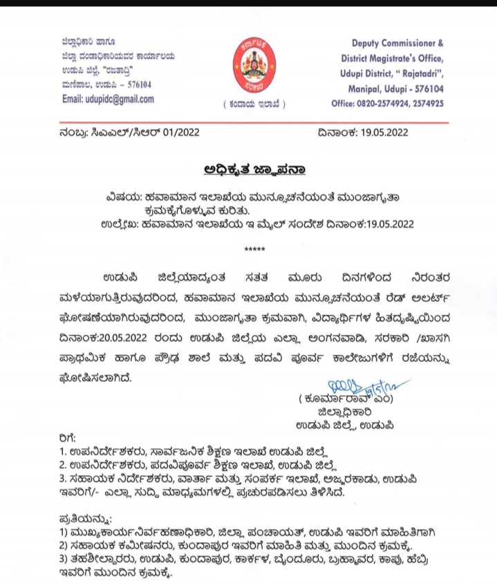 ಜಿಲ್ಲೆಯಾದ್ಯಂತ ಸತತ ಮೂರು ದಿನಗಳಿಂದ ನಿರಂತರ ಮಳೆಯಾಗುತ್ತಿರುವುದರಿಂದ ಹವಾಮಾನ ಇಲಾಖೆಯ ಮುನ್ಸೂಚನೆಯಂತೆ ರೆಡ್ ಅಲರ್ಟ್ ಘೋಷಣೆಯಾಗಿರುವುದರಿಂದ ಮುಂಜಾಗೃತಾ ಕ್ರಮವಾಗಿ ವಿದ್ಯಾರ್ಥಿಗಳ ಹಿತದೃಷ್ಟಿಯಿಂದ ಮೇ.20ರಂದು ಜಿಲ್ಲೆಯ ಎಲ್ಲಾ ಅಂಗನವಾಡಿ, ಸರಕಾರಿ ಹಾಗೂ ಖಾಸಗಿ ಪ್ರಾಥಮಿಕ ಮತ್ತು ಪ್ರೌಢಶಾಲೆ, ಪದವಿ ಪೂರ್ವ ಕಾಲೇಜುಗಳಿಗೆ ರಜೆಯನ್ನು ಘೋಷಿಸಿ ಜಿಲ್ಲಾಧಿಕಾರಿ ಕೂರ್ಮಾರಾವ್ ಅವರು ಗುರುವಾರ ಆದೇಶ ಹೊರಡಿಸಿದ್ದಾರೆ.