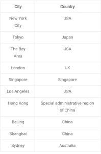 ವಿಶ್ವದ ಟಾಪ್ 10 ಶ್ರೀಮಂತ ನಗರಗಳ ಪಟ್ಟಿಯಲ್ಲಿ ಈ ಎರಡು ದೇಶಗಳ ನಗರಗಳು ಪ್ರಾಬಲ್ಯ ಹೊಂದಿವೆ. ಅವು ಯುನೈಟೆಡ್ ಸ್ಟೇಟ್ಸ್ ಮತ್ತು ಚೀನಾ.