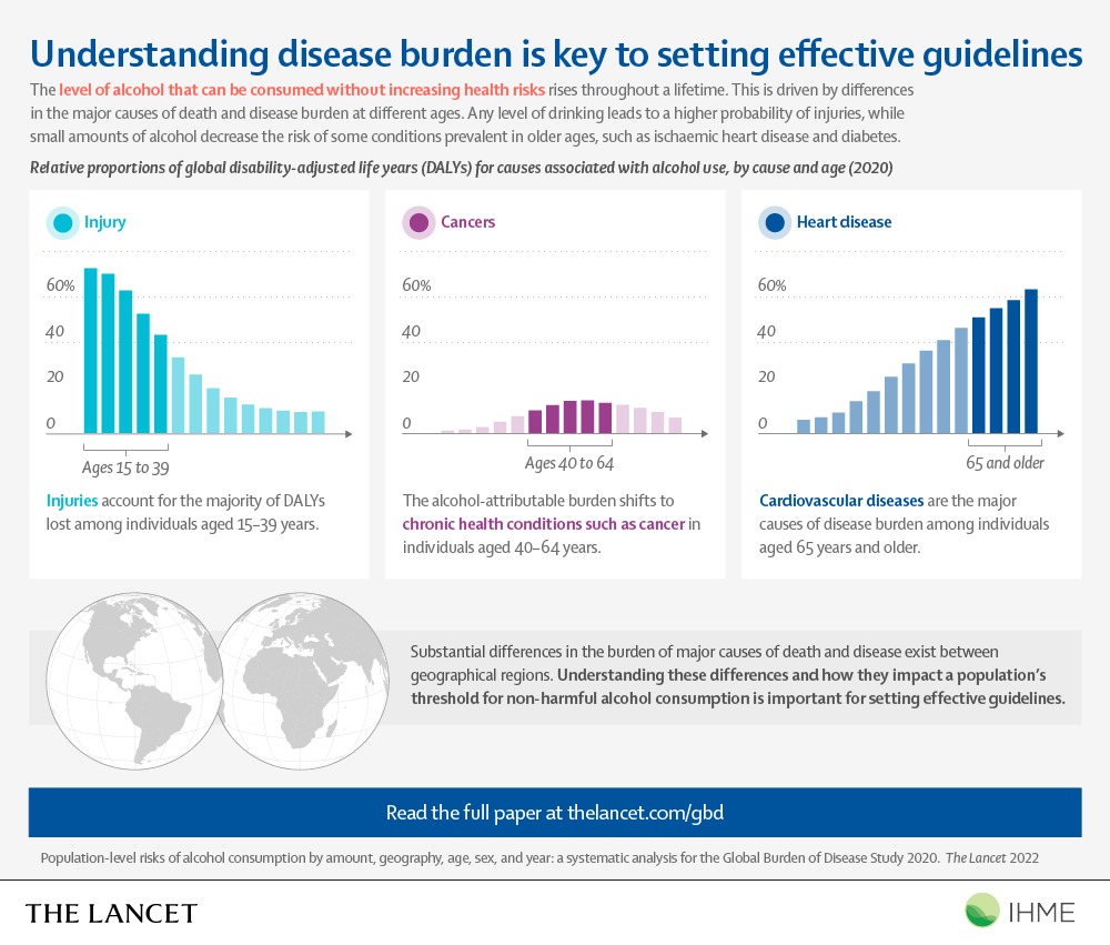 ಲಾನ್ಸೆಟ್ ನೀಡಿದ ವರದಿಯ ಪ್ರಕಾರ, 2020 ರಲ್ಲಿ 1.78 ದಶಲಕ್ಷಕ್ಕೂ ಹೆಚ್ಚು ಸಾವುಗಳಿಗೆ ಆಲ್ಕೋಹಾಲ್ ಮಾತ್ರ ಕಾರಣವಾಗಿದೆ. ಇದು 15-49 ವಯೋಮಾನದವರಲ್ಲಿ ಮರಣಕ್ಕೆ ಇರುವ ಪ್ರಮುಖ ಕಾರಣವಾಗಿದೆ ಎಂದು ಹೇಳಲಾಗಿದೆ. ಆದ್ದರಿಂದ, ಜಾಗತಿಕ ಆರೋಗ್ಯ ನಷ್ಟವನ್ನು ಕಡಿಮೆ ಮಾಡಲು ಈ ನಿರ್ದಿಷ್ಟ ವಯಸ್ಸಿನ ಜನಸಂಖ್ಯಾಶಾಸ್ತ್ರಕ್ಕೆ ಬಲವಾದ ಮದ್ಯ- ಮಧ್ಯಸ್ಥಿಕೆಗಳು ಅಗತ್ಯವಿದೆ ಎಂದು ಜರ್ನಲ್ ಶಿಫಾರಸು ಮಾಡಿದೆ.
