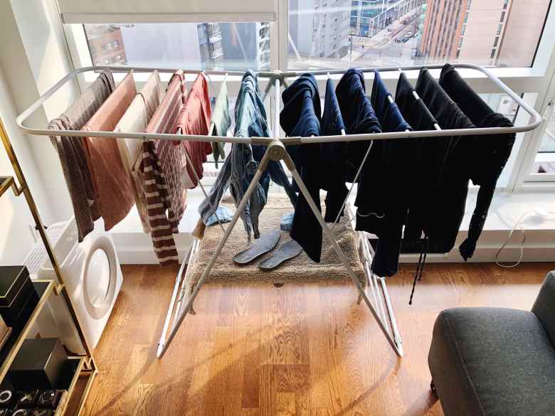ಯಂತ್ರದಲ್ಲಿ ಒದ್ದೆಯಾದ ಬಟ್ಟೆಗಳನ್ನು ನೇತುಹಾಕಲು ಮನೆಯೊಳಗೆ ಸ್ಟೇನ್ಲೆಸ್ ಸ್ಟೀಲ್ ಸ್ಟ್ಯಾಂಡ್ ಬಳಸಿ. ನಂತರ ಫ್ಯಾನ್ ಅಡಿಯಲ್ಲಿ ಸ್ಟ್ಯಾಂಡ್ ಅನ್ನು ಇರಿಸಬಹುದು.