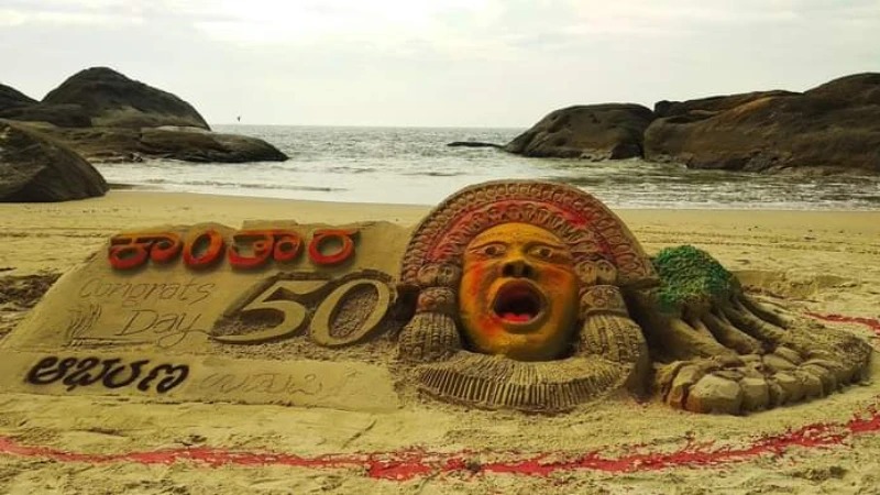 ಮುನ್ನೂರಕ್ಕೂ ಹೆಚ್ಚು ಚಿತ್ರಮಂದಿರಗಳಲ್ಲಿ ಕಾಂತಾರ ಸಿನಿಮಾ ಐವತ್ತು ದಿನಗಳ ಪ್ರದರ್ಶನ ಕಂಡಿದ್ದು, ಬಹುತೇಕ ಚಿತ್ರಮಂದಿರಗಳು ಹೌಸ್ ಫುಲ್ ಪ್ರದರ್ಶನಕ್ಕೆ ಇನ್ನೂ ಸಾಕ್ಷಿ ಆಗುತ್ತಿವೆ. ದೇಶ ವಿದೇಶದಲ್ಲೂ 50ನೇ ದಿನದ ಸಂಭ್ರಮವನ್ನು ಅನೇಕ ಚಿತ್ರಮಂದಿರಗಳು ಆಚರಿಸಿವೆ. ಇದೇ ಹೊತ್ತಿನಲ್ಲೇ ಮಣಿಪಾಲದ ಸ್ಯಾಂಡ್ ಆರ್ಟ್ ಕಲಾವಿದರು ಕಾಪು ಬೀಚ್ ನಲ್ಲಿ ಇಂಥದ್ದೊಂದು ಕಲಾಕೃತಿಯನ್ನು ಮಾಡುವ ಮೂಲಕ ಶುಭ ಹಾರೈಸಿದ್ದಾರೆ.