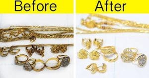 ಚಿನ್ನದ ಆಭರಣಗಳನ್ನು ಸ್ವಚ್ಛಗೊಳಿಸಲು, ಮೊದಲು ಒಂದು ಬೌಲ್ನಲ್ಲಿ ಬಿಸಿ ನೀರನ್ನು ಹಾಕಿಕೊಂಡು ಅದರಲ್ಲಿ ಲಿಕ್ವೆಡ್ ಸೋಪ್ ಹಾಕಿ ಮಿಶ್ರಣ ಮಾಡಿಕೊಳ್ಳಿ. ಈಗ ಕೊಳಕು ಆಭರಣಗಳನ್ನು ಅದರಲ್ಲಿ ಅದ್ದಿ, ಸ್ವಲ್ಪ ಸಮಯದವರೆಗೆ ಹಾಗೆ ಬಿಡಿ!! ಆ ಬಳಿಕ ಮೃದುವಾದ ಬ್ರಷ್ ಮೂಲಕ ಸ್ವಚ್ಛ ಮಾಡಿ ಆಭರಣವನ್ನು ಶುದ್ಧ ನೀರಿನಿಂದ ತೊಳೆದು ಮೃದುವಾದ ಬಟ್ಟೆಯಿಂದ ಒರೆಸಿ.