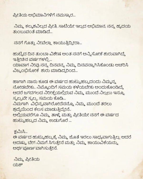 ಯಶ್, ತಮ್ಮ ಪತ್ರವನ್ನು ಸೋಷಿಯಲ್ ಮೀಡಿಯಾದಲ್ಲಿ ಪ್ರಕಟಿಸಿದ್ದು ಪ್ರತಿವರ್ಷದಂತೆ ಅಭಿಮಾನಿಗಳ ಜೊತೆ ತನ್ನ ಹುಟ್ಟು ಹಬ್ಬ ಆಚರಿಸಬೇಕು, ಕೆಲವು ಸಮಯ ಅವರೊಂದಿಗೆ ಕಳೆಯಬೇಕು ಎಂಬ ಆಶೆ ನನಗೂ ಇತ್ತು. ಆದರೆ ಕೆಲವು ಕಾರಣಾಂತರಗಳಿಂದ ಈ ಬಾರಿಯ ಹುಟ್ಟಿದ ಹಬ್ಬದ ಆಚರಣೆಯಲ್ಲಿ ಭಾಗವಹಿಸಲು ನನಗೆ ಸಾಧ್ಯ ಆಗುತ್ತಿಲ್ಲ ಎಂದು ಹೇಳಿದ್ದಾರೆ. ಜೊತೆಗೆ ಅಭಿಮಾನಿಗಳಿಗಾಗಿ ಹೊಸತೇನೋ ಒಂದನ್ನು ಕೈಗೆತ್ತಿಕೊಂಡಿದ್ದು ಸದ್ಯ ಅದರ ಕೆಲಸದಲ್ಲಿ ತೊಡಗಿದ್ದೇನೆ, ಅಲ್ಲಿಯವರೆಗಿನ ನಿಮ್ಮ ತಾಳ್ಮೆ ಹಾಗೂ ಪ್ರೀತಿಯೇ ನನಗೆ ಈ ವರ್ಷದ ಹುಟ್ಟುಹಬ್ಬದ ಉಡುಗೊರೆ ಎಂದು ಮನವಿ ಮಾಡಿದ್ದಾರೆ. ಇದರಿಂದ ಅಭಿಮಾನಿಗಳಿಗೆ ನಿರಾಶೆಯೂ ಉಂಟಾಗಿದೆ.