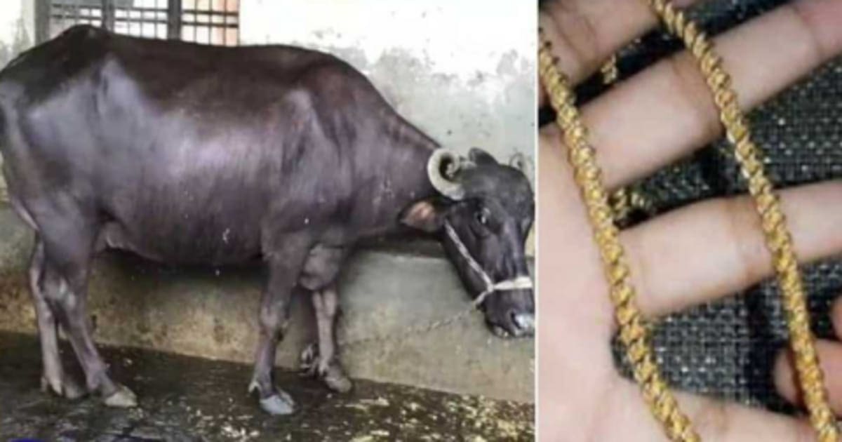 ಮನೆಯಲ್ಲಿ ಸಾಕಿದ್ದ ಎಮ್ಮೆಗೆ ತರಕಾರಿ ಸಿಪ್ಪೆಯನ್ನು ಹಾಕುವಾಗ ಮಾಲಕಿಯ ಕುತ್ತಿಗೆಯಲ್ಲಿದ್ದ ಚಿನ್ನದ ಸರವು ಆಕಸ್ಮಿಕವಾಗಿ ಕಳಚಿ ಬಿದ್ದಿದೆ. ಇದು ಸುಮಾರು 35 ಗ್ರಾಂನ 2.5 ಲಕ್ಷ ರೂ. ಮೌಲ್ಯದ ಚಿನ್ನದ ಸರವಾಗಿದ್ದು, ಅದನ್ನು ಎಮ್ಮೆ ಸಿಪ್ಪೆಯ ಜೊತೆಗೆ ನುಂಗಿಬಿಟ್ಟಿದೆ. ಇದು ಮಹಿಳೆಯ ಗಮನಕ್ಕೆ ಬಂದಿಲ್ಲ.