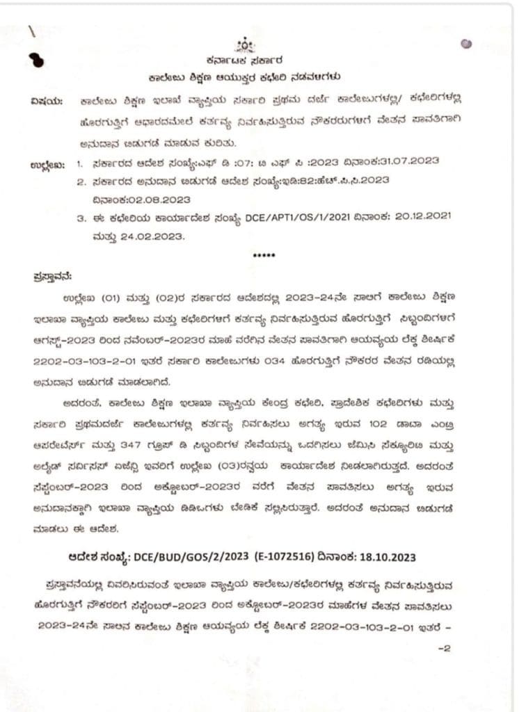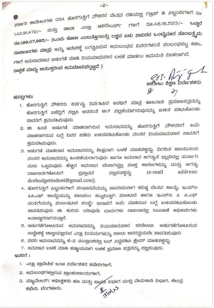 ಇಲಾಖಾ ವ್ಯಾಪ್ತಿಯ ಕಾಲೇಜು/ಕಛೇರಿಗಳಲ್ಲಿ ಕರ್ತವ್ಯ ನಿರ್ವಹಿಸುತ್ತಿರುವ ಹೊರಗುತ್ತಿಗೆ ನೌಕರರಿಗೆ ಸೆಪ್ಟೆಂಬರ್-2023 ರಿಂದ ಅಕ್ಟೋಬರ್-2023ರ ತಿಂಗಳ ವೇತನ ಪಾವತಿ ಮಾಡಲು ಸರ್ಕಾರಿ ಕಾಲೇಜುಗಳು 034, ಹೊರಗುತ್ತಿಗೆ ನೌಕರರ ವೇತನದಡಿಯಲ್ಲಿ ಗ್ರೂಪ್ ಡಿ ಸಿಬ್ಬಂದಿಗಳಿಗೆ ರೂ 1.40.91.472/- 20 ಅಪರೇಟರ್ಸ್ ಗಳಿಗೆ 48.16.523/- ಒಟ್ಟಾರೆ ರೂ.1,89,07,995/- ಆದೇಶದ ಅನುಬಂಧದ ವಿವರಗಳ ಅನುಸಾರ ಸಂಬಂಧಪಟ್ಟ ಡಿಡಿಒ ಗಳಗೆ ಅನುದಾನದಾನ ಬಿಡುಗಡೆ ಮಾಡಿ ನಿಯಮಾನುಸಾರ ಬಳಸಲು ಅವಕಾಶ ಕಲ್ಪಿಸಲಾಗಿದೆ.