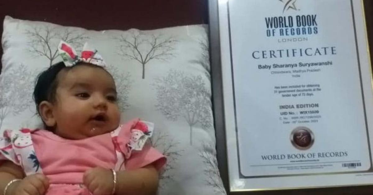 ಮಧ್ಯಪ್ರದೇಶದ ಛಿಂದವಾಡ ಜಿಲ್ಲೆಯ ಕೇಸರಿನಂದನ್ ಸೂರ್ಯವಂಶಿ ಮತ್ತು ಪ್ರಿಯಾಂಕಾ ದಂಪತಿಗೆ ಜುಲೈ 8ರಂದು ಶರಣ್ಯಾ ಎಂಬ ಹೆಣ್ಣು ಮಗು(Girl Child) ಜನಿಸಿದ್ದಾಳೆ. ಜನನವಾದ ಮೂರು ತಿಂಗಳಿಗೆ ಬೇಬಿ ಶರಣ್ಯಾ ವಿಶ್ವ ದಾಖಲೆಯನ್ನು ಬರೆದಿದ್ದಾಳೆ. ತಮ್ಮ ಮಗುವಿನ ಜನನವನ್ನು ಶಾಶ್ವತವಾಗಿ ಸ್ಮರಣೀಯವಾಗಿಸುವ ನಿಟ್ಟಿನಲ್ಲಿ ಏನಾದರೂ ಮಾಡಬೇಕೆಂದು ಬಯಸಿದ ದಂಪತಿ 28 ಗುರುತಿನ ಚೀಟಿ ದಾಖಲೆಗಳೊಂದಿಗೆ ಮಗುವಿನ ಹೆಸರನ್ನು ವಿಶ್ವ ದಾಖಲೆಗೆ (World Book Of Records) ಸೇರಿಸಿದ್ದಾರೆ.