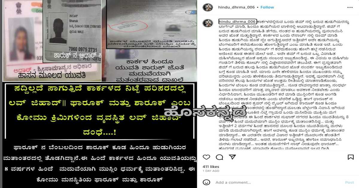 ಹಿಂದೂ ಧರ್ಮ ಎನ್ನುವ ಇನ್ಸ್ಟಾಗ್ರಾಮ್ ಪೇಜ್ ನಲ್ಲಿ ಜಿಲ್ಲೆಯ ಕಾರ್ಕಳ ಮೂಲದ ಮುಸ್ಲಿಂ ಯುವಕರಿಬ್ಬರ ಮೇಲೆ ಗಂಭೀರ ಆರೋಪ ವ್ಯಕ್ತವಾಗಿದ್ದು, ಹಿಂದೂ ಯುವತಿಯರನ್ನು ಪುಸಲಾಯಿಸಿ ಮತಾಂತರ, ಮದುವೆ, ರೆಸಾರ್ಟ್ ನಲ್ಲಿ ಸ್ಟೇ ಮುಂತಾದ ವಿಚಾರಗಳ ಸಹಿತ ಫಾರುಕ್-ಶಾರುಕ್ ಎಂಬಿಬ್ಬರ ಕರ್ಮಕಾಂಡ ಬಯಲಾಗಿದೆ.