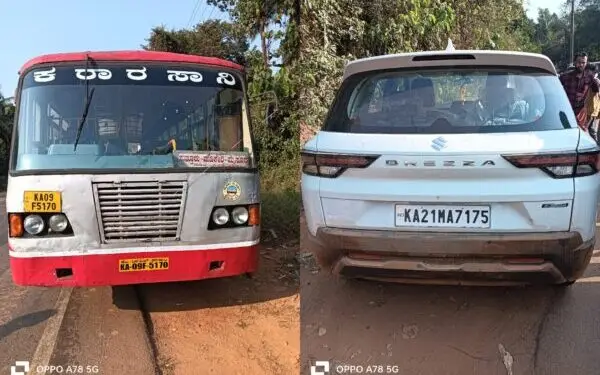 Accident: ಪುತ್ತೂರು: ಸಂಟ್ಯಾರ್ ಸಮೀಪ ಕೆ.ಎಸ್.ಆರ್.ಟಿ.ಸಿ ಬಸ್ ಹಾಗೂ ಬ್ರೆಜ್ಜಾ ಕಾರಿನ ನಡುವೆ ಶನಿವಾರ ಮಧ್ಯಾಹ್ನ ಅಪಘಾತ ನಡೆದಿದೆ.